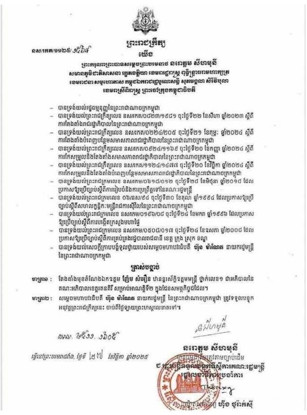 ព្រះករុណា ព្រះបាទ សម្តេចព្រះបរមនាថ នរោត្តម សីហមុនី ព្រះមហាក្សត្រនៃព្រះរាជាណាចក្រកម្ពុជា បានចេញព្រះរាជក្រឹត្យត្រាស់បង្គាប់តែងតាំង ឯកឧត្តម ញ៉ែម សំអឿន ឋានន្តរស័ក្តិ ឧត្តមមន្ត្រី ថ្នាក់លេខ១ (ខ្ពស់ផុតលេខ) ជាអភិបាលខេត្តរតនគិរី សម្រាប់អាណត្តិទី២ ក្នុងដែនសមត្ថកិច្ចដដែល នៅថ្ងៃទី២៧ ខែវិច្ឆិកា ឆ្នាំ២០២៥។