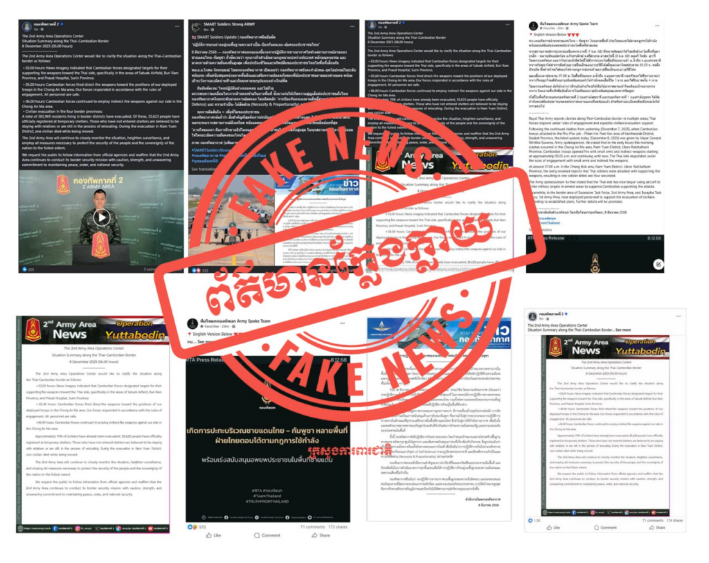ក្រសួងការពារជាតិ នៃកម្ពុជា នៅព្រឹកថ្ងៃទី៨ ខែធ្នូ ឆ្នាំ២០២៥នេះ បានចេញមកច្រានចោលការចោទប្រកាន់របស់ផេកផ្លូវការរបស់កងទ័ពថៃ និងបណ្តាញសារព័ត៌មានថៃមួយចំនួន ថាកម្ពុជាបើកការបាញ់មុននិងប្រើសព្វាវុធធុនធ្ងន់នៅតាមបណ្តោយព្រំដែនកម្ពុជា-ថៃ ជាព័ត៌មានមិនពិត។