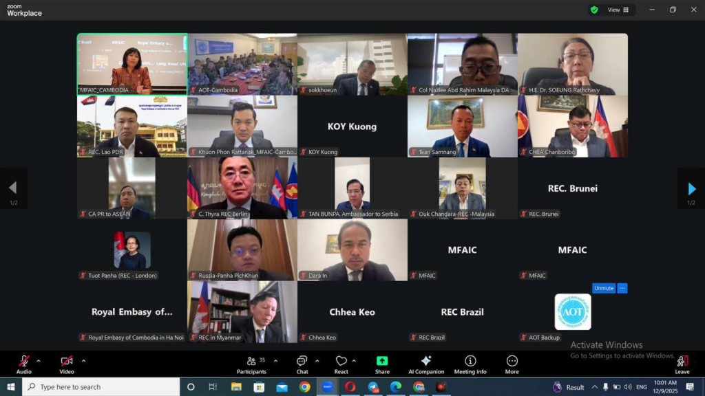 នៅព្រឹកថ្ងៃទី០៩ ខែធ្នូ ឆ្នាំ២០២៥នេះ ក្រសួងការបរទេស និងសហប្រតិបត្តិការអន្តរជាតិ បានបើកកិច្ចប្រជុំបន្ទាន់ជាមួយអង្គទូតបរទេសប្រចាំព្រះរាជាណាចក្រកម្ពុជាចំនួន៣០អង្គទូត និង០៣អង្គការអន្តរជាតិ ក្នុងនោះក៏មានតំណាងអង្គការសហប្រជាជាតិចូលរួមផងដែរ ដើម្បីធ្វើបទបង្ហាញអំពីស្ថានការណ៍នៅតាមបន្ទាត់ព្រំដែនកម្ពុជា-ថៃ ក្នុងយោធភូមិភាគ ទី៤ និងយោធភូមិភាគទី៥ ក្រោយយោធាថៃ បានបើកការវាយប្រហារឈ្លានពានមកលើកម្ពុជា ដែលសកម្មភាពនៃរំលោភបំពានលើ”បទឈប់បាញ់” និង”សេចក្តីថ្លែងការណ៍រួមស្តីពីកិច្ចព្រមព្រៀងសន្តិភាពរវាង កម្ពុជានិងថៃ” អស់រយៈពេល៣ថ្ងៃមកហើយ ចាប់តាំងពីថ្ងៃទី០៧ ខែធ្នូ ឆ្នាំ២០២៥ រហូតមកទល់ថ្ងៃនេះ។