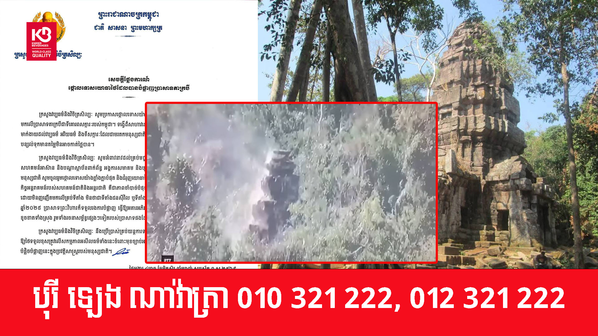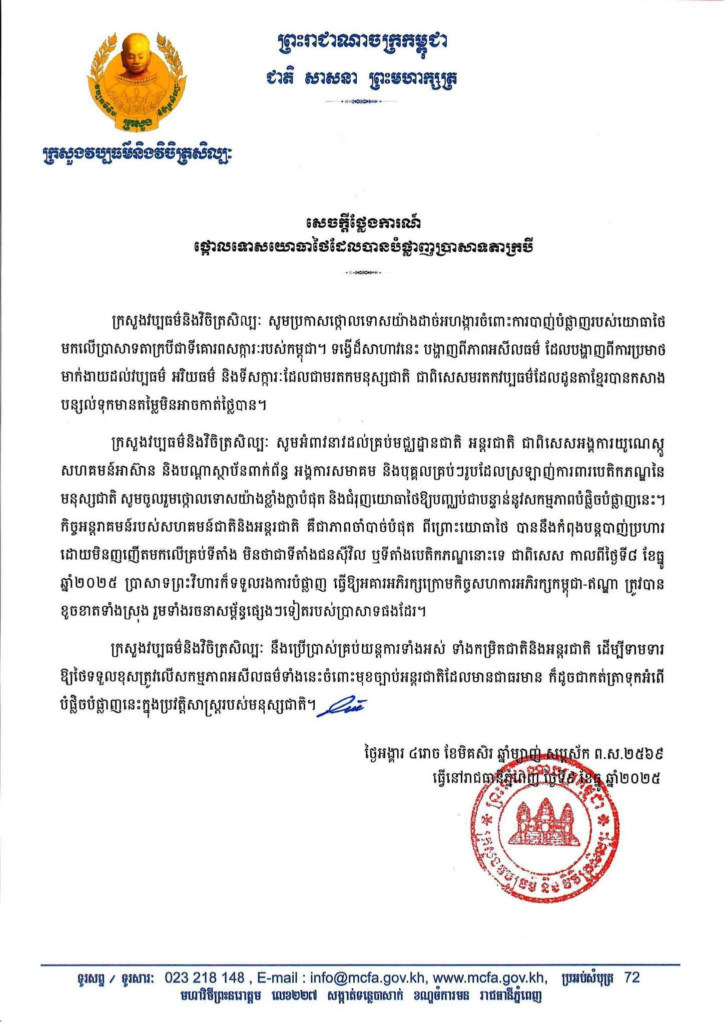 យោងតាមសេចក្ដីថ្លែងការណ៍ ចុះថ្ងៃទី៩ ខែធ្នូ ឆ្នាំ២០២៥ ក្រសួងវប្បធម៌បានចាត់ទុកទង្វើដ៏សាហាវនេះ បង្ហាញពីភាពអសីលធម៌ ដែលបង្ហាញពីការប្រមាថ មាក់ងាយដល់វប្បធម៌ អរិយធម៌ និងទីសក្ការៈដែលជាមរតកមនុស្សជាតិ ជាពិសេសមរតកវប្បធម៌ដែលដូនតាខ្មែរបានកសាង បន្សល់ទុកមានតម្លៃមិនអាចកាត់ថ្លៃបាន។