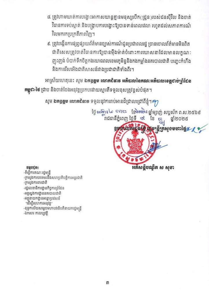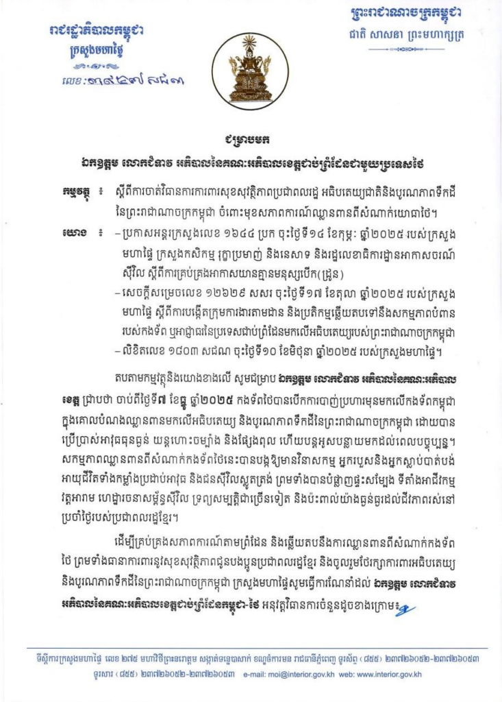 តាមរយៈសេចក្ដីជូនដំណឹង ចុះថ្ងៃទី៩ ខែធ្នូ ឆ្នាំ២០២៥ ក្រសួងមហាផ្ទៃ បានបញ្ជាក់ថា ដើម្បីគ្រប់គ្រងសភាពការណ៍តាមព្រំដែន និងឆ្លើយតបនឹងការឈ្លានពានពីសំណាក់កងទ័ពថៃ ព្រមទាំងធានាការពារនូវសុខសុវត្ថិភាពជូនបងប្អូនប្រជាពលរដ្ឋខ្មែរ និងចូលរួមថែរក្សាការពារអធិបតេយ្យ និងបូរណភាពទឹកដីនៃព្រះរាជាណាចក្រកម្ពុជា ក្រសួងមហាផ្ទៃសូមធ្វើការណែនាំដល់ ឯកឧត្តម លោកជំទាវ អភិបាលនៃគណៈអភិបាលខេត្តជាប់ព្រំដែនកម្ពុជា-ថៃ អនុវត្តវិធានការចំនួនដូចខាងក្រោម៖