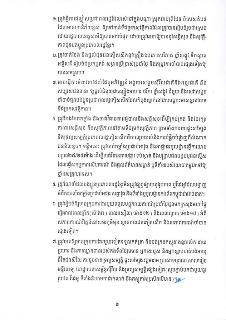 - ត្រូវធ្វើការជម្លៀសប្រជាពលរដ្ឋដែលរស់នៅក្នុងបណ្តាស្រុកជាប់ព្រំដែន ពិសេសតំបន់ដែលមានហានិភ័យខ្ពស់ ឱ្យទៅកាន់ទីជម្រកសុវត្ថិភាពដែលត្រូវបានរៀបចំរួចជាស្រេច ដោយរដ្ឋបាលខេត្តសាមីឱ្យបានឆាប់បំផុត ដោយត្រូវធានាឱ្យបាននូវសន្តិសុខ និងសុវត្ថិភាពជូនបងប្អូនប្រជាពលរដ្ឋខ្មែរ។