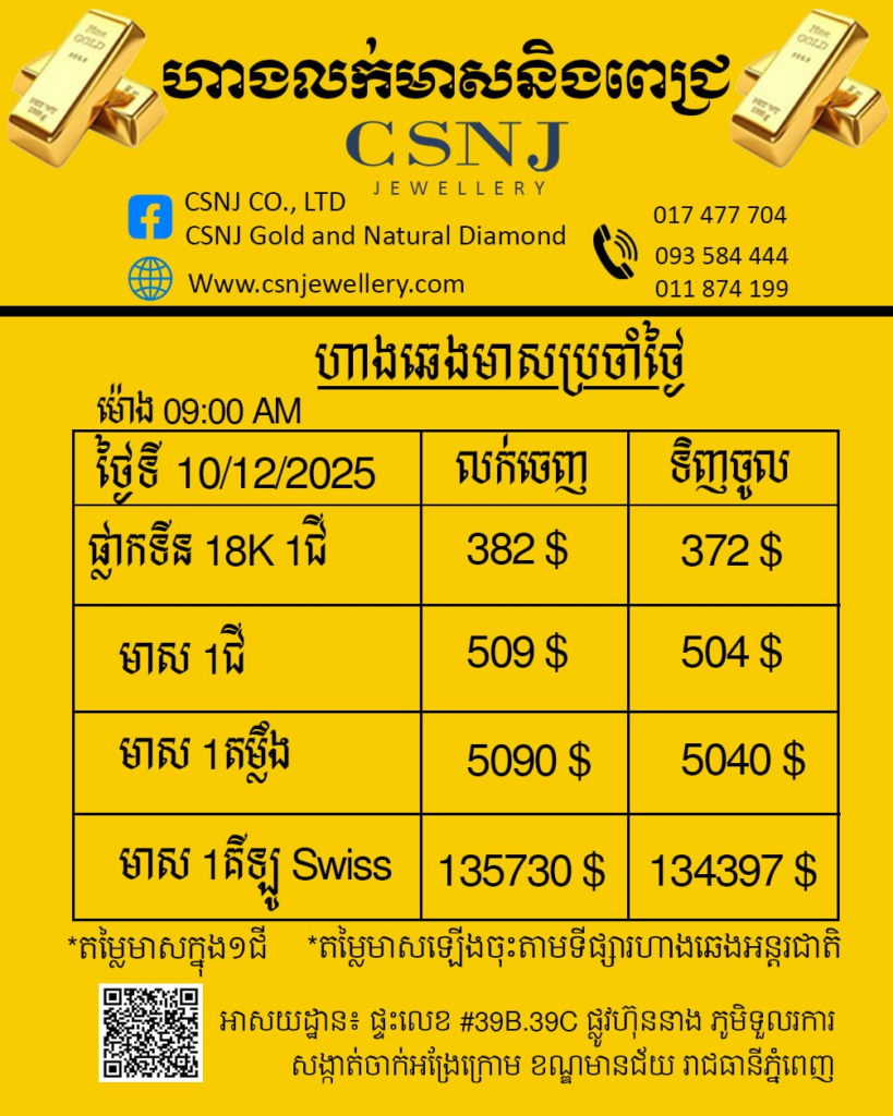 តម្លៃមាសនៅថ្ងៃទី១០ ខែធ្នូ ឆ្នាំ២០២៥នេះ បានឡើងថ្លៃបន្ដិចវិញហើយ បើធៀបនឹងថ្ងៃម្សិលមិញ ពោលគឺមានតម្លៃ ៥០៩ដុល្លារ នៅក្នុងមួយជី ជាតម្លៃលក់ចេញ និងទិញចូលក្នុងតម្លៃ ៥០៤ដុល្លារ។ នេះបើយោងតាមហាងឆេងមាស ពីហាងមាសពេជ្រ CSNJ របស់លោកឧកញ៉ា ចិន សំណាង នាព្រឹក ម៉ោង៩:០០ នាទី ថ្ងៃទី១០ ខែធ្នូ។