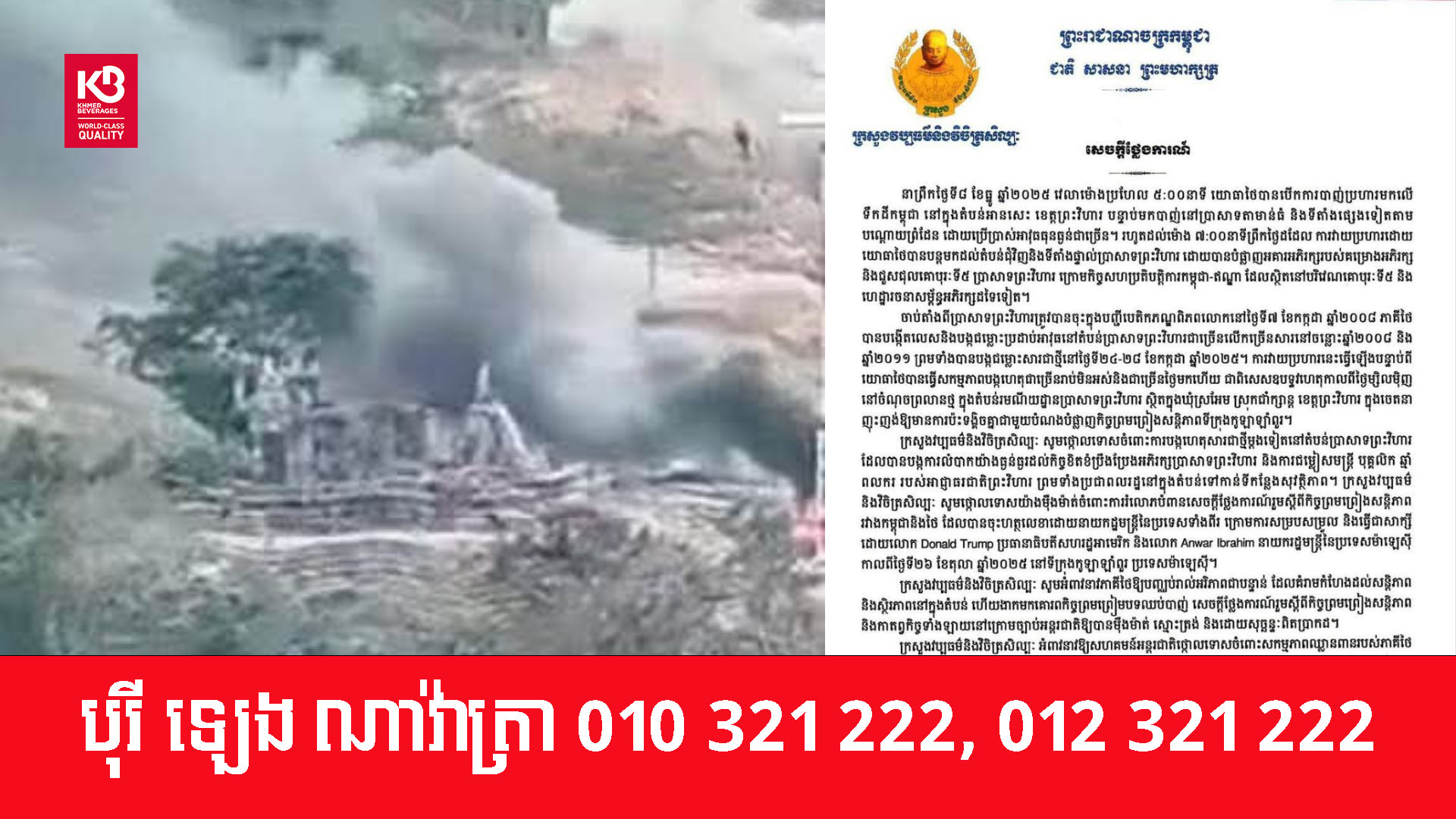 ក្រសួងវប្បធម៌ ថ្កោលទោសការបាញ់ប្រហាររបស់យោធាថៃមកលើប្រាសាទព្រះវិហារនិងតំបន់ជុំវិញនិងអំពាវនាវ ឱ្យបញ្ឈប់ជាបន្ទាន់នូវសកម្មភាពបំផ្លាញសន្តិភាពនិងស្ថិរភាពក្នុងតំបន់
