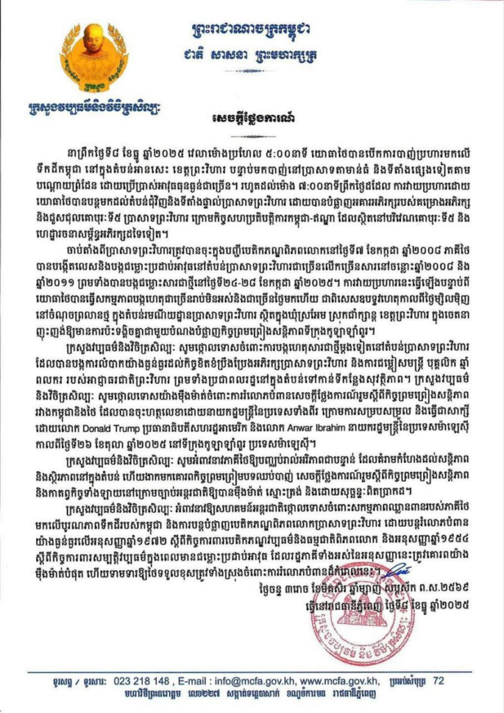 ជាមួយគ្នានោះ ក្រសួងវប្បធម៌និងវិចិត្រសិល្បៈ បានអំពាវនាវឱ្យសហគមន៍អន្តរជាតិថ្កោលទោសចំពោះសកម្មភាពឈ្លានពានរបស់ភាគីថ មកលើបូរណភាពទឹកដីរបស់កម្ពុជា និងការបន្តបំផ្លាញបេតិកភណ្ឌពិភពលោកប្រាសាទព្រះវិហារ ដោយបន្តរំលោភបំពានយ៉ាងធ្ងន់ធ្ងរលើអនុសញ្ញាឆ្នាំ១៩៧២ ស្ដីពីកិច្ចការពារបេតិកភណ្ឌវប្បធម៌និងធម្មជាតិពិភពលោក និងអនុសញ្ញាឆ្នាំ១៩៥៤ស្ដីពីកិច្ចការពារសម្បត្តិវប្បធម៌ក្នុងពេលមានជម្លោះប្រដាប់អាវុធ ដែលរដ្ឋភាគីទាំងអស់នៃអនុសញ្ញានេះត្រូវគោរពយ៉ាង ម៉ឺងម៉ាត់បំផុត ហើយទាមទារឱ្យថៃទទួលខុសត្រូវទាំងស្រុងចំពោះការរំលោភបំពានដ៏កំរោលនេះ៕