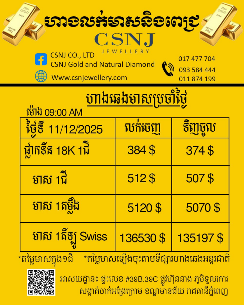 តម្លៃមាសនៅថ្ងៃទី១១ ខែធ្នូ ឆ្នាំ២០២៥នេះ បានហក់ឡើងខ្ពស់បន្ថែមទៀតហើយ បើធៀបនឹងថ្ងៃម្សិលមិញ ពោលគឺមានតម្លៃ ៥១២ដុល្លារ នៅក្នុងមួយជី ជាតម្លៃលក់ចេញ និងទិញចូលក្នុងតម្លៃ ៥០៧ដុល្លារ។ នេះបើយោងតាមហាងឆេងមាស ពីហាងមាសពេជ្រ CSNJ របស់លោកឧកញ៉ា ចិន សំណាង នាព្រឹក ម៉ោង៩:០០ នាទី ថ្ងៃទី១១ ខែធ្នូ។