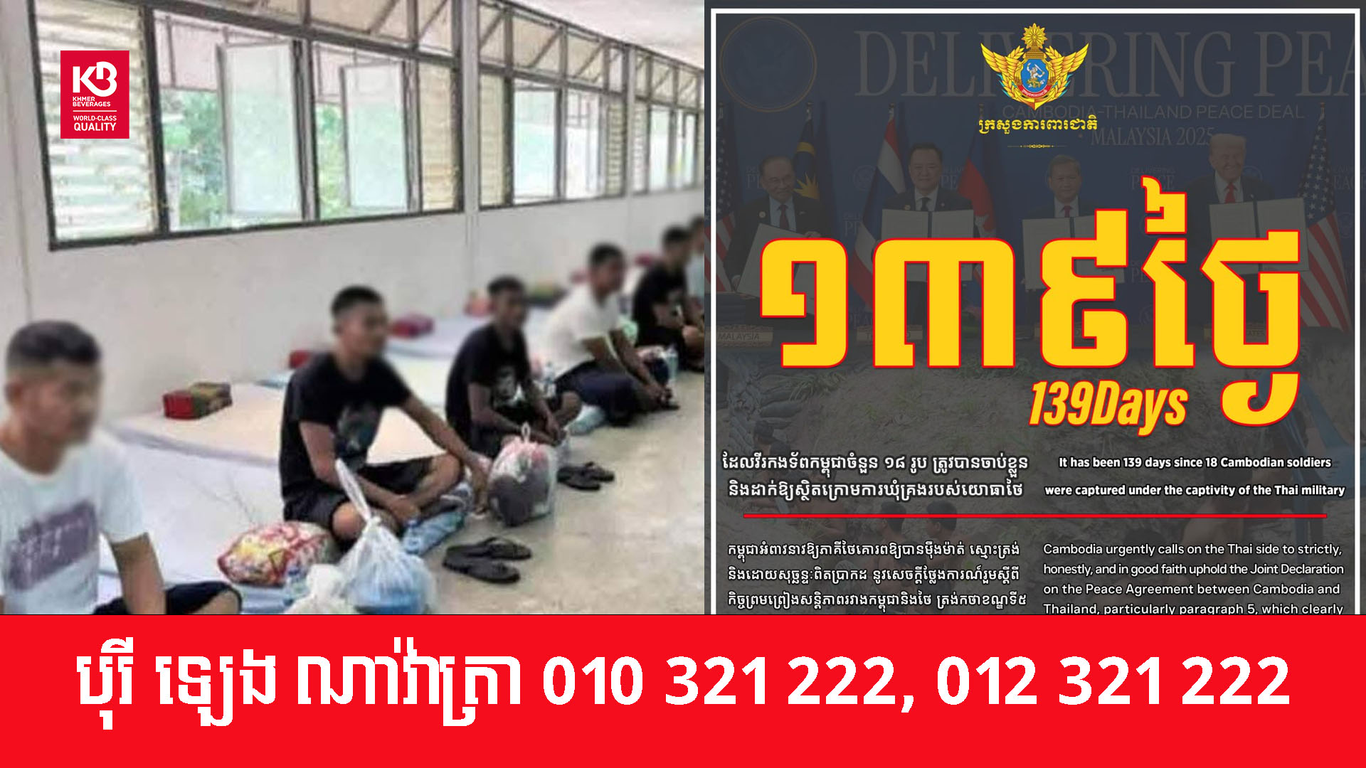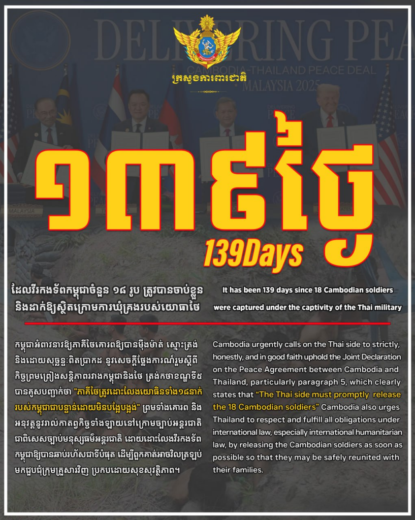 ក្រសួងការពារជាតិ បានបញ្ជាក់ថា ថ្ងៃនេះជា ថ្ងៃទី១៣៩ ហើយ ដែលវីរកងទ័ពកម្ពុជាចំនួន១៨រូប ត្រូវបានចាប់ខ្លួន និងដាក់ឱ្យស្ថិតក្រោមការឃុំគ្រងរបស់យោធាថៃ។ ទន្ទឹមនឹងនោះ ក្រសួងការពារជាតិ ក៏បានជំរុញឱ្យភាគីថៃដោះលែងយោធិនទាំង១៨នាក់របស់កម្ពុជាជាបន្ទាន់ដោយមិនបង្អែបង្អង់។