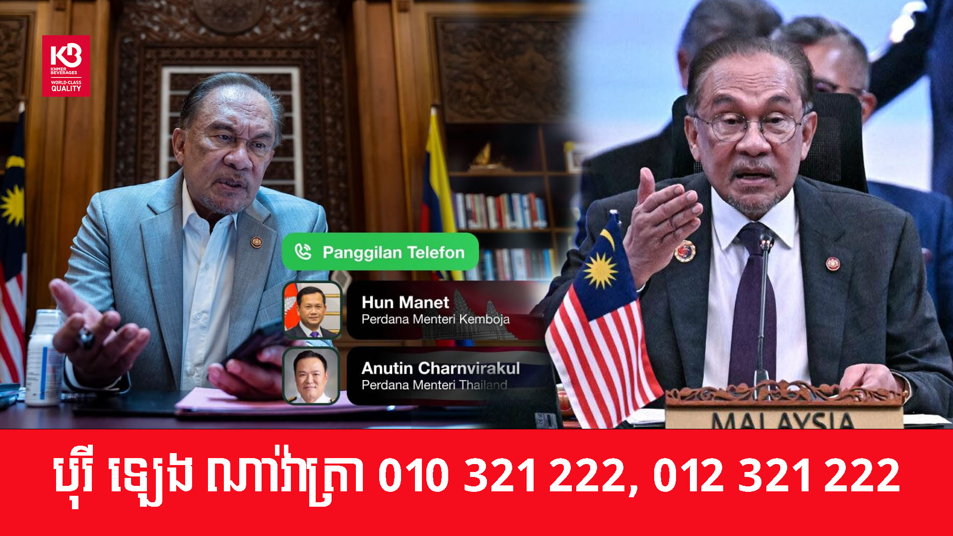 នាយករដ្ឋមន្ត្រីម៉ាឡេស៊ី លោក Anwar Ibrahim បានប្រកាសនៅថ្ងៃពុធថា លោកបានទាក់ទងជាមួយមេដឹកនាំថៃ និងកម្ពុជា ហើយភាគីទាំងពីរបានបង្ហាញបំណងចង់ដោះស្រាយជម្លោះព្រំដែនរបស់ពួកគេឱ្យបានឆាប់បំផុតតាមដែលអាចធ្វើទៅបាន។ នេះបើតាមការចេញផ្សាយ ដោយសារព័ត៌មាន Bloomberg កាលថ្ងៃទី១៧ ខែធ្នូ ឆ្នាំ២០២៥។