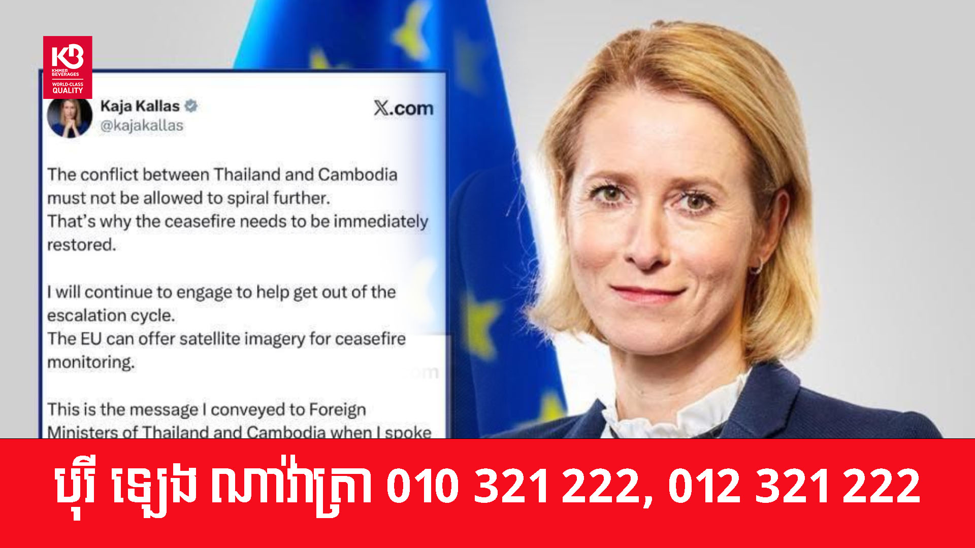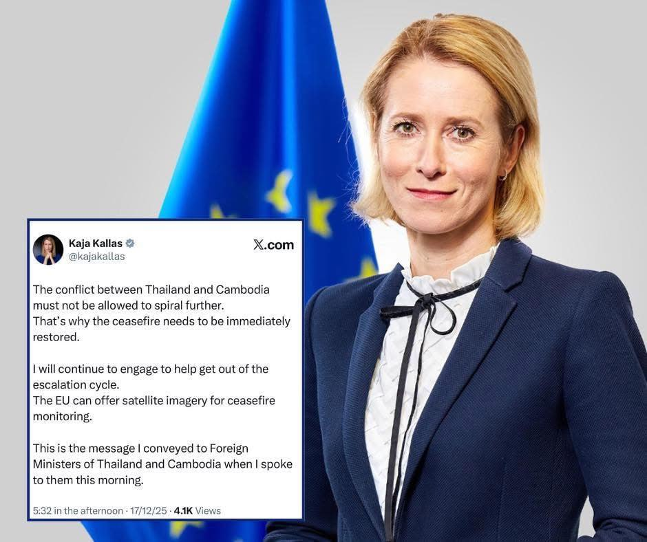 នៅក្នុងសេចក្តីថ្លែងការណ៍ លោកស្រី Kaja Kallas តំណាងជាន់ខ្ពស់សហភាពអឺរ៉ុបទទួលបន្ទុកកិច្ចការបរទេស និងគោលនយោបាយសន្តិសុខ និងជាអនុប្រធានគណៈកម្មការអឺរ៉ុប គូសបញ្ជាក់ថា ជម្លោះរវាងប្រទេសកម្ពុជានិងប្រទេសថៃ មិនត្រូវបណ្តោយឱ្យរាលដាលកាន់តែធ្ងន់ធ្ងរឡើយ។ ហេតុដូច្នេះហើយ បទឈប់បាញ់ចាំបាច់ត្រូវតែស្តារឡើងវិញជាបន្ទាន់។