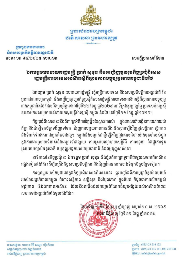 លោក ប្រាក់ សុខុន ឧបនាយករដ្ឋមន្ត្រី រដ្ឋមន្ត្រីការបរទេស និងសហប្រតិបត្តិការអន្តរជាតិនឹងអញ្ជើញចូលរួមកិច្ចប្រជុំពិសេសរដ្ឋមន្ត្រីការបរទេសអាស៊ានស្ដីពីស្ថានភាពបច្ចុប្បន្ន រវាងកម្ពុជានិងថៃ ដែលនឹងប្រព្រឹត្តទៅនៅថ្ងៃទី២២ ខែធ្នូ ឆ្នាំ២០២៥ នៅទីក្រុងគូឡាឡាំពួ ប្រទេសម៉ាឡេស៊ី តបតាមការសម្រេចរបស់នាយករដ្ឋមន្ត្រីម៉ាឡេស៊ី កម្ពុជា និងថៃ នៅថ្ងៃទី១១ ខែធ្នូ ឆ្នាំ២០២៥។