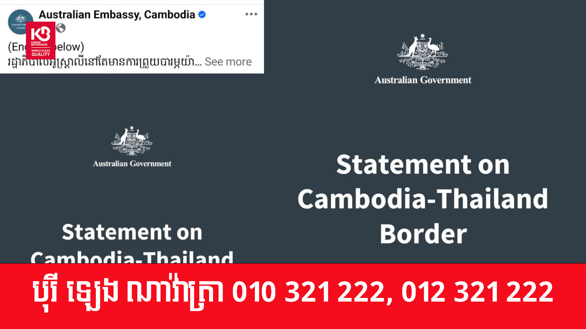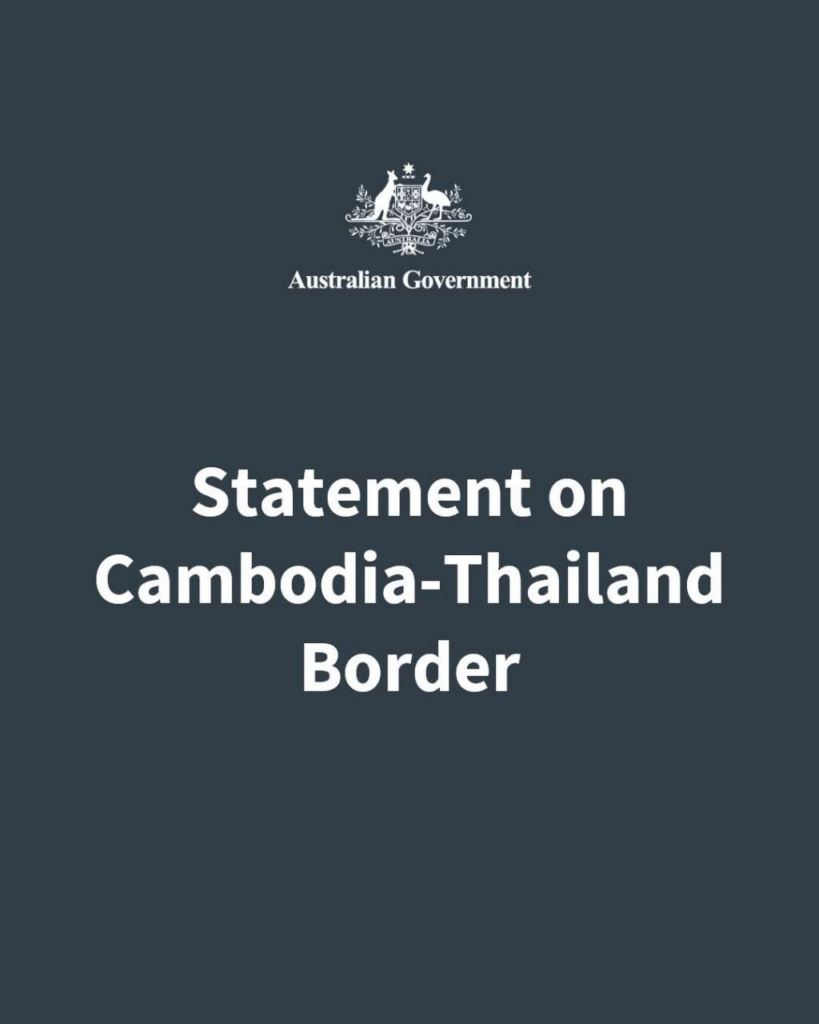 ស្ថានទូតអូស្រ្តាលីប្រចាំប្រទេសកម្ពុជា បានលើកឡើងថា រដ្ឋាភិបាលអូស្ត្រាលីនៅតែមានការព្រួយបារម្ភយ៉ាងខ្លាំងចំពោះការប៉ះទង្គិចយោធារវាងកម្ពុជានិងថៃ ដែលកំពុងបន្តកើតឡើង រួមទាំងការកើនឡើងយ៉ាងឆាប់រហ័សនៃទំហំនិងភាពតានតឹងនៃជម្លោះ ការប្រើប្រាស់អាវុធបំផ្លិចបំផ្លាញធុនធ្ងន់ និងផលប៉ះពាល់ផ្នែកមនុស្សធម៌ដែលកំពុងកើនឡើងចំពោះភាគីទាំងពីរ។