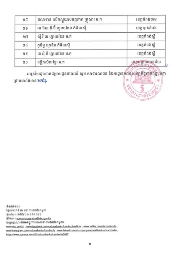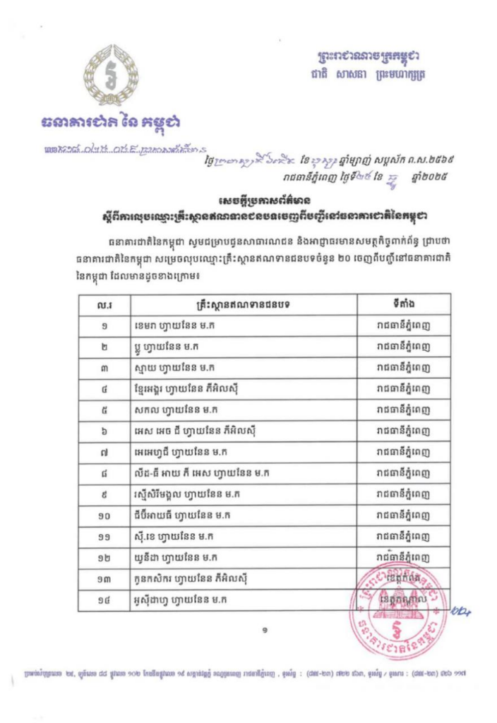 ធនាគារជាតិនៃកម្ពុជា នៅថ្ងៃទី២៥ ខែធ្នូ ឆ្នាំ២០២៥ បានចេញសេចក្ដីប្រកាសព័ត៌មានសម្រេចលុបឈ្មោះគ្រឹះស្ថានឥណទានជនបទចំនួន២០ ចេញពីបញ្ជី។