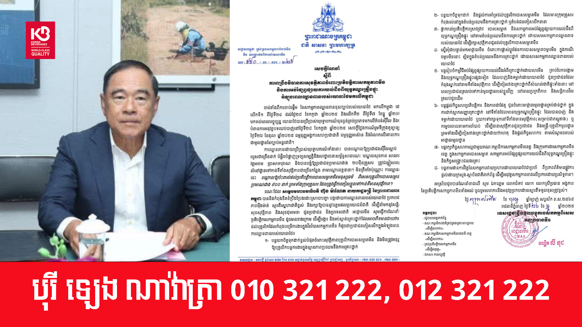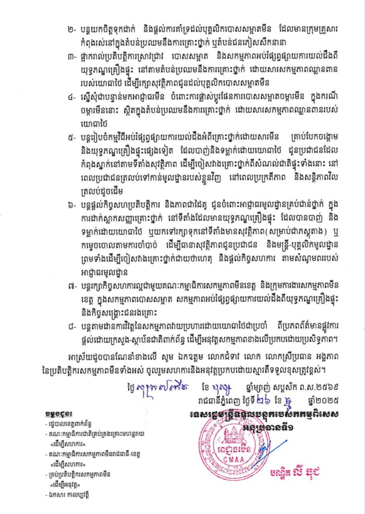អាជ្ញាធរកម្ពុជា គ្រប់គ្រងសកម្មភាពកម្ចាត់មីន និងសង្គ្រោះជនពិការដោយសារមីន បានចេញសេចក្តីណែនាំ ស្តីពី ការពង្រឹងវិធានការសុវត្ថិភាពចំពោះប្រតិបត្តិការសកម្មភាពមីន និងការអប់រំផ្សព្វផ្សាយការយល់ដឹងពីយុទ្ធភណ្ឌគ្រឿងផ្ទុះ អំឡុងពេលឈ្លានពានរបស់យោធាថៃមកលើកម្ពុជា។