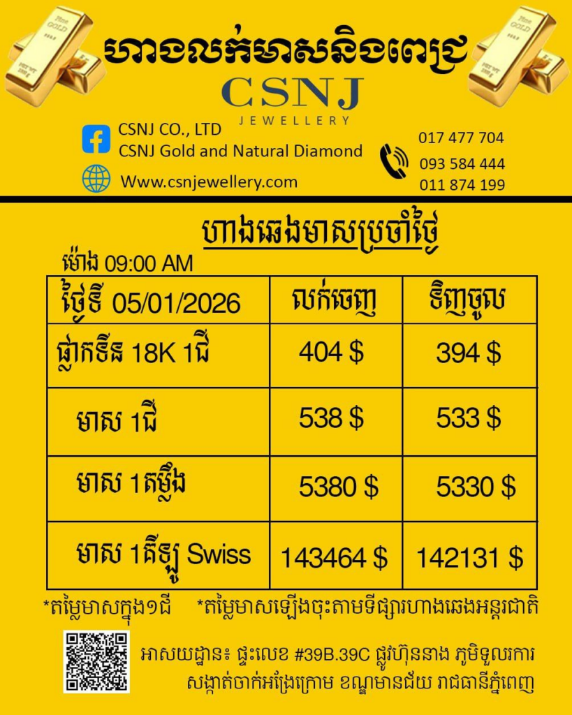 តម្លៃមាសនៅថ្ងៃទី៥ ខែមករា ឆ្នាំ២០២៦នេះ បានឡើងថ្លៃបន្ដិចវិញហើយ បើធៀបនឹងថ្ងៃម្សិលមិញ ពោលគឺមានតម្លៃ ៥៣៨ដុល្លារ នៅក្នុងមួយជី ជាតម្លៃលក់ចេញ និងទិញចូលក្នុងតម្លៃ ៥៣៣ដុល្លារ។ នេះបើយោងតាមហាងឆេងមាស ពីហាងមាសពេជ្រ CSNJ របស់លោកឧកញ៉ា ចិន សំណាង នាព្រឹក ម៉ោង៩:០០ នាទី ថ្ងៃទី៥ ខែមករា។