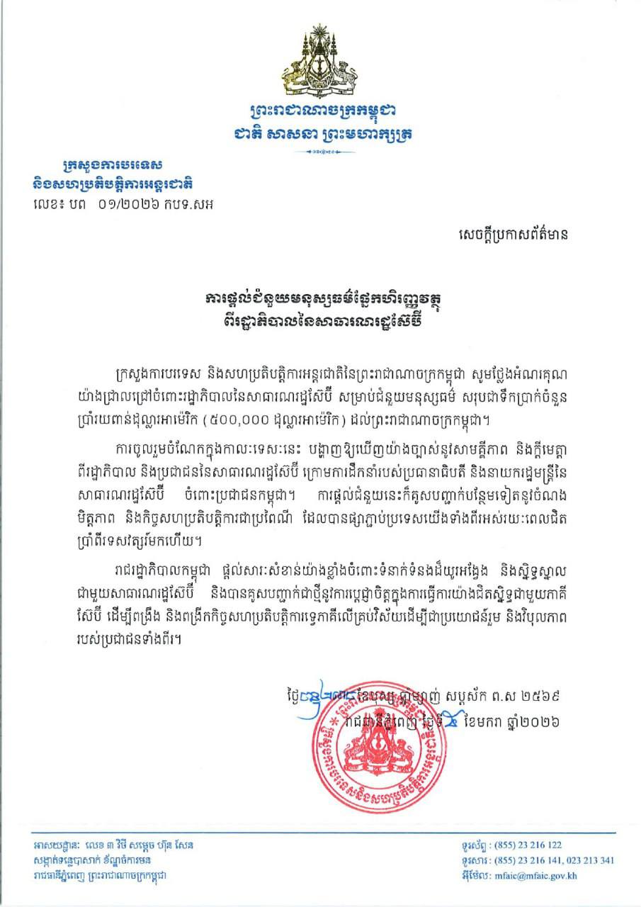 ក្រសួងការបរទេសកម្ពុជា បានបញ្ជាក់ថា ការផ្តល់ជំនួយនេះ ក៏គូសបញ្ជាក់បន្ថែមទៀតនូវចំណងមិត្តភាព និងកិច្ចសហប្រតិបត្តិការជាប្រពៃណី ដែលបានផ្សាភ្ជាប់ប្រទេសទាំងពីរអស់រយៈពេលជិត ៧ ទសវត្សរ៍មកហើយ៕