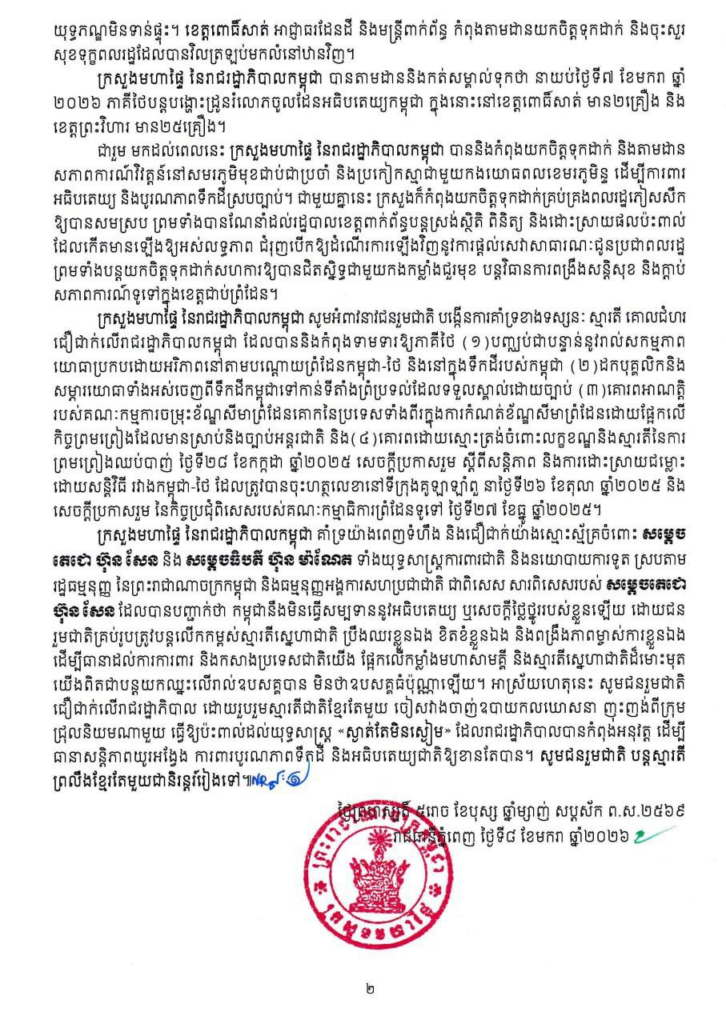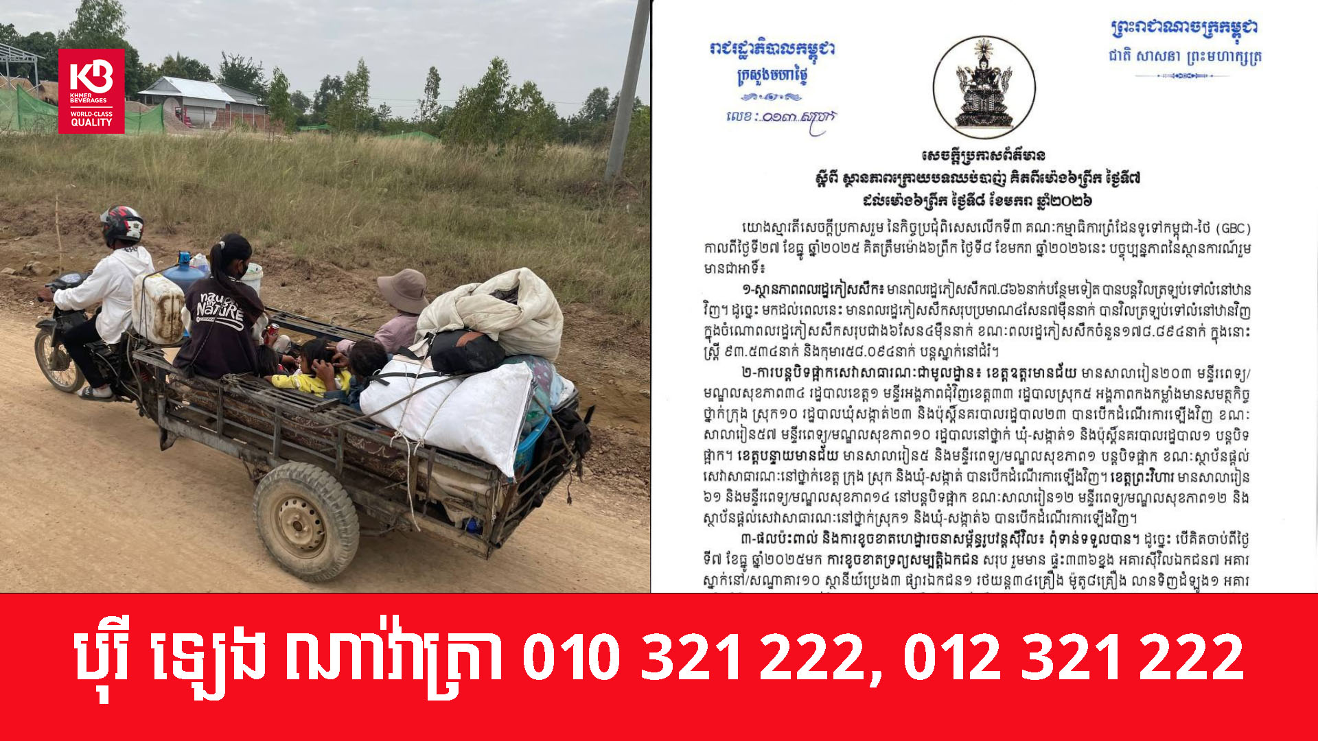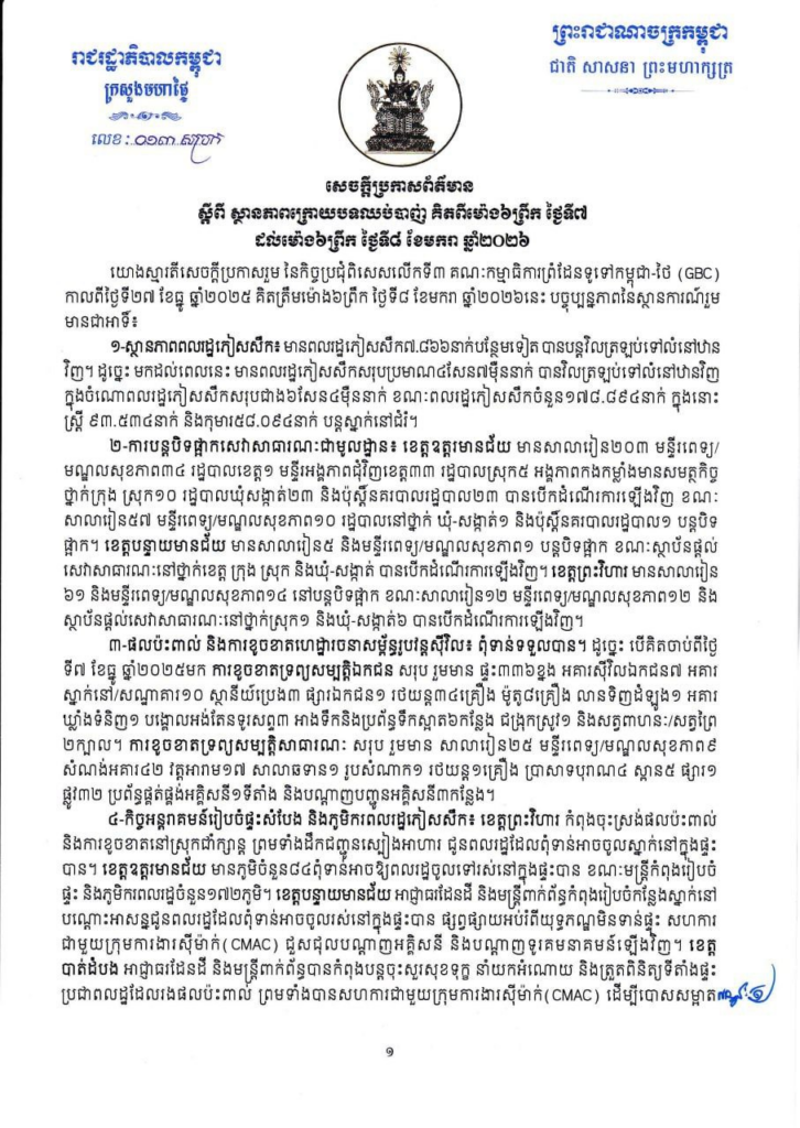 យោងតាមសេចក្តីប្រកាសព័ត៌មាន ស្តីពី ស្ថានភាពក្រោយបទឈប់បាញ់ របស់ក្រសួងក្រសួងមហាផ្ទៃ នារសៀលថ្ងៃទី៨ ខែមករា ឆ្នាំ២០២៦នេះ បានឱ្យដឹងថា មានពលរដ្ឋភៀសសឹក៧.៨៦៦នាក់បន្ថែមទៀត បានបន្តវិលត្រឡប់ទៅលំនៅឋានវិញ។ ដូច្នេះ មកដល់ពេលនេះ មានពលរដ្ឋភៀសសឹកសរុបប្រមាណ៤សែន៧ម៉ឺននាក់ បានវិលត្រឡប់ទៅលំនៅឋានវិញ ក្នុងចំណោពលរដ្ឋភៀសសឹកសរុបជាង៦សែន៤ម៉ឺននាក់ ខណៈពលរដ្ឋភៀសសឹកចំនួន១៧៨.៨៩៤នាក់ ក្នុងនោះ ស្ត្រី ៩៣.៥៣៤នាក់ និងកុមារ៥៨.០៩៤នាក់ បន្តស្នាក់នៅជំរំ។