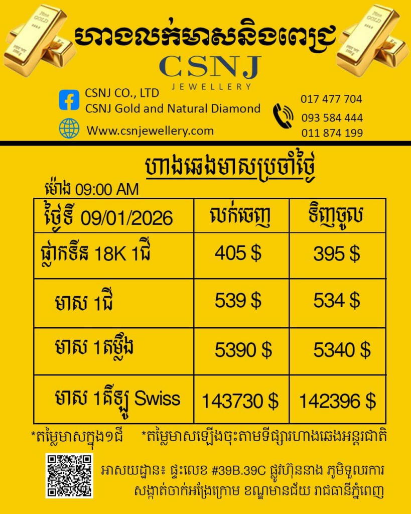 តម្លៃមាសនៅថ្ងៃទី៩ ខែមករា ឆ្នាំ២០២៦នេះ ឡើងថ្លៃបន្ដិច បើធៀបនឹងថ្ងៃម្សិលមិញ ពោលគឺមានតម្លៃ ៥៣៩ដុល្លារ នៅក្នុងមួយជី ជាតម្លៃលក់ចេញ និងទិញចូលក្នុងតម្លៃ ៥៣៤ដុល្លារ។ នេះបើយោងតាមហាងឆេងមាស ពីហាងមាសពេជ្រ CSNJ របស់លោកឧកញ៉ា ចិន សំណាង នាព្រឹក ម៉ោង៩:០០ នាទី ថ្ងៃទី៩ ខែមករា។
