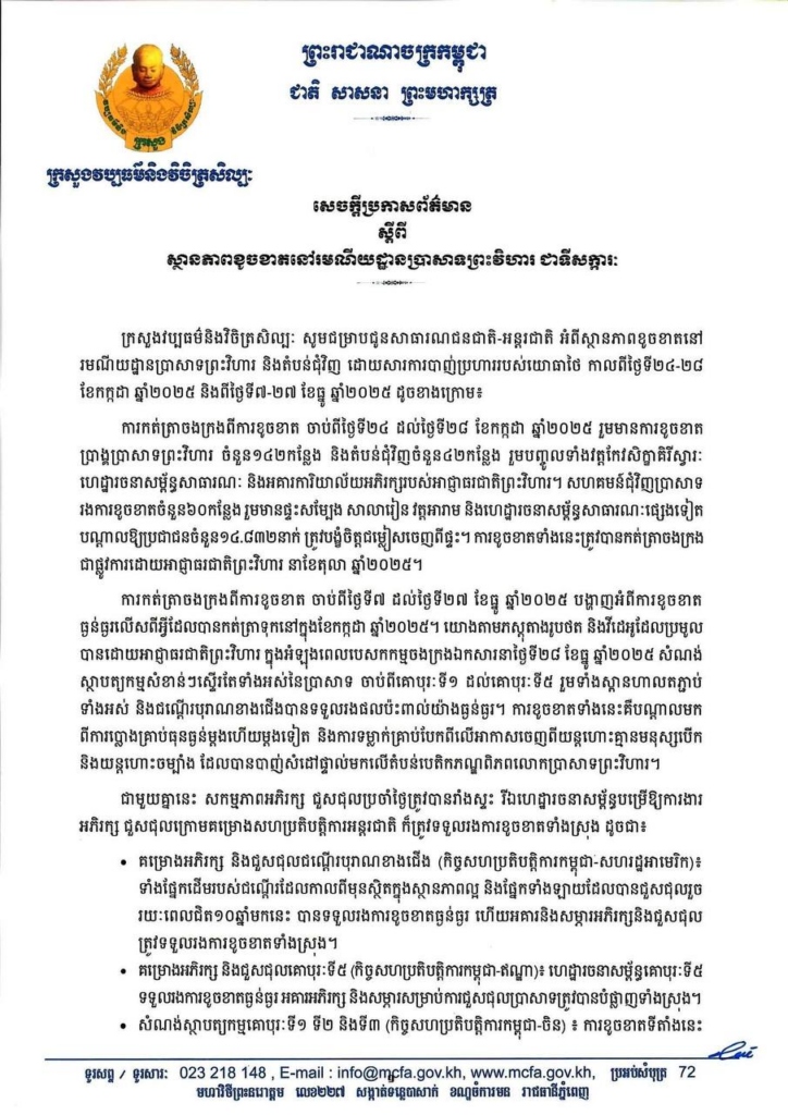 នាថ្ងៃទី១២ ខែមករា ឆ្នាំ២០២៦នេះ ក្រសួងវប្បធម៌និងវិចិត្រសិល្បៈ បានចេញសេចក្តីប្រកាសព័ត៌មាន ស្តីពី ស្ថានភាពខូចខាតនៅរមណីយដ្ឋានប្រាសាទព្រះវិហារ ជាទីសក្ការៈ និងតំបន់ជុំវិញ ដោយសារការបាញ់ប្រហាររបស់យោធាថៃ កាលពីថ្ងៃទី២៤-២៨ ខែកក្កដា ឆ្នាំ២០២៥ និងពីថ្ងៃទី៧-២៧ ខែធ្នូ ឆ្នាំ២០២៥។