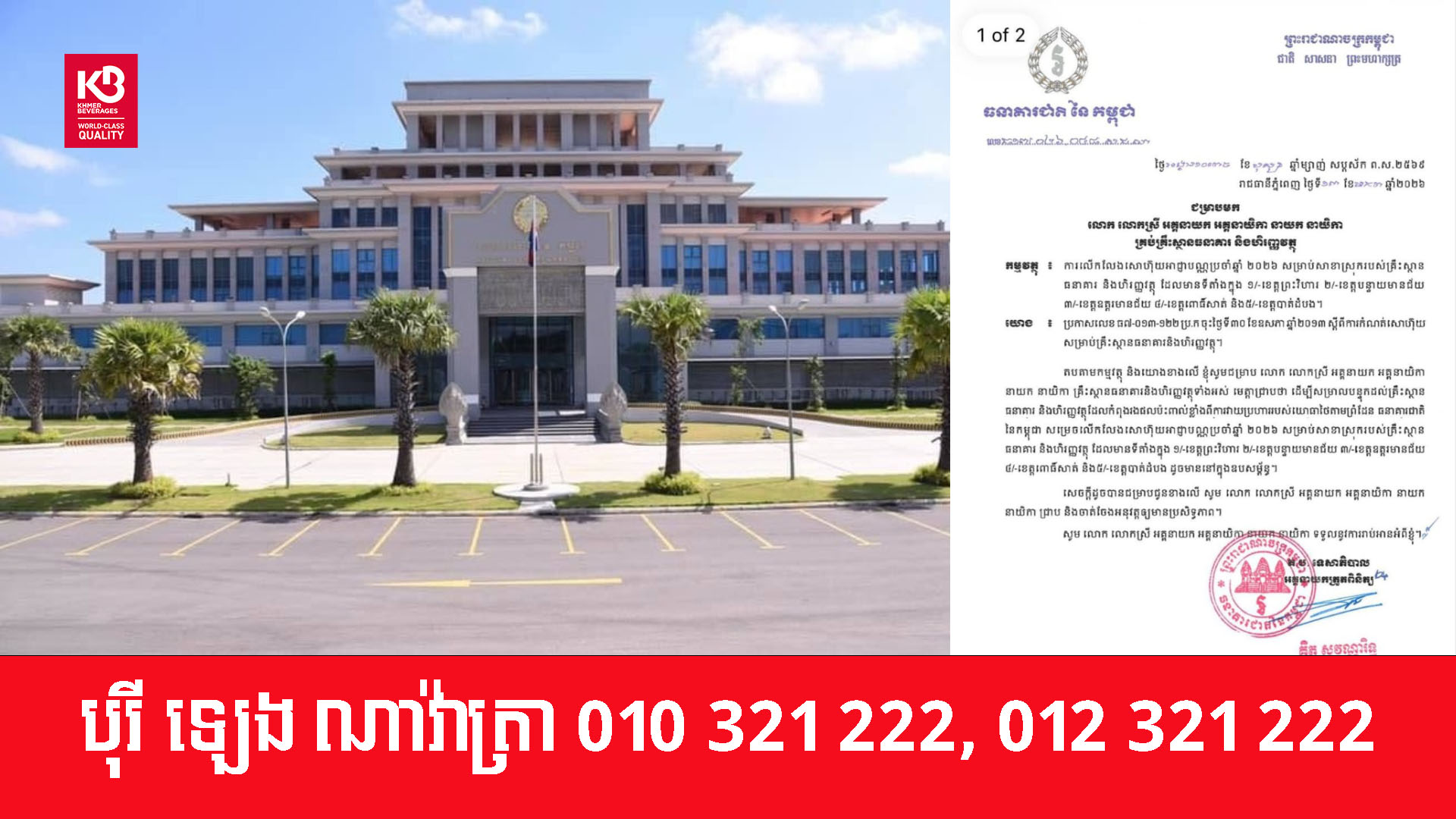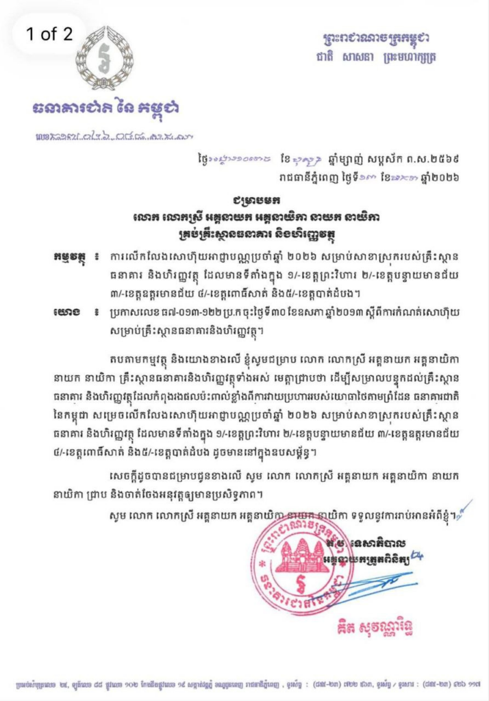 យោងតាមលិខិតលេខ ធ១៧.០២៦.០៤៨.ស.ជ.ណ ចុះថ្ងៃទី១៣ ខែមករា ឆ្នាំ២០២៦ របស់ធនាគារជាតិនៃកម្ពុជា បានឱ្យដឹងថា ដើម្បីសម្រាលបន្ទុកដល់គ្រឹះស្ថាន ធនាគារ និងហិរញ្ញវត្ថុដែលកំពុងរងផលប៉ះពាល់ខ្លាំងពីការវាយប្រហាររបស់យោធាថៃតាមព្រំដែន ធនាគារជាតិនៃកម្ពុជា សម្រេចលើកលែងសោហ៊ុយអាជ្ញាបណ្ណប្រចាំឆ្នាំ ២០២៦ សម្រាប់សាខាស្រុករបស់គ្រឹះស្ថាន ធនាគារ និងហិរញ្ញវត្ថុ ដែលមានទីតាំងក្នុងខេត្តចំនួន៥ រួមមាន ១/-ខេត្តព្រះវិហារ ២/-ខេត្តបន្ទាយមានជ័យ ៣/-ខេត្តឧត្តរមានជ័យ ៤/-ខេត្តពោធិ៍សាត់ និង៥/-ខេត្តបាត់ដំបង។