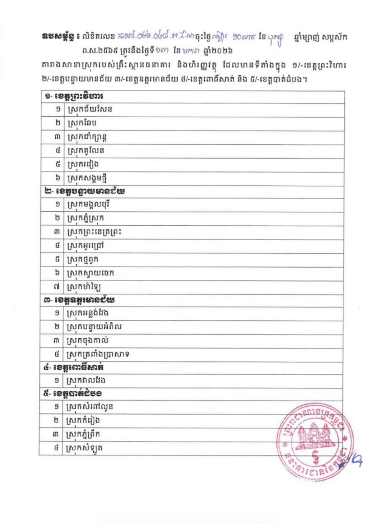ធនាគារជាតិនៃកម្ពុជា បានលើកលែងសោហ៊ុយអាជ្ញាបណ្ណប្រចាំឆ្នាំ២០២៦ សាខាស្រុកមួយចំនួននៃខេត្ត ដែលរងផលប៉ះពាល់ពីការវាយប្រហាររបស់យោធាថៃតាមព្រំដែន ដល់គ្រឹះស្ថានធនាគារ និងហិរញ្ញវត្ថុ។