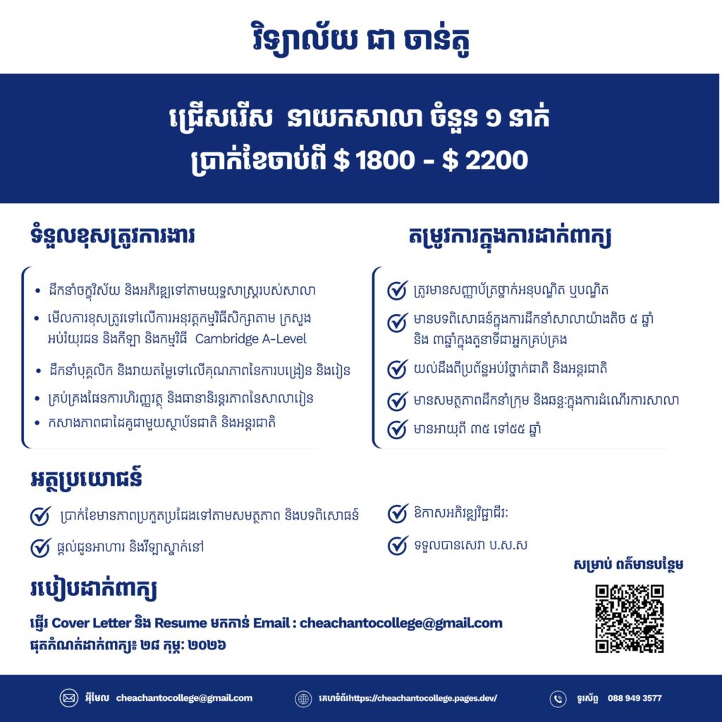 ប្រសិនបើអ្នកចាប់អារម្មណ៍ សូមធ្វើការដាក់ពាក្យដោយផ្ញើរ Resume និង Cover Letter មកកាន់ Email: [email protected]។ ផុតកំណត់ដាក់ពាក្យ ៖ ២៨ ខែកុម្ភៈ ឆ្នាំ២០២៦។ សម្រាប់ពត៌មានបន្ថែមសូមទាក់ទងតាមរយៈអ៊ីម៉ែល៖ [email protected]។