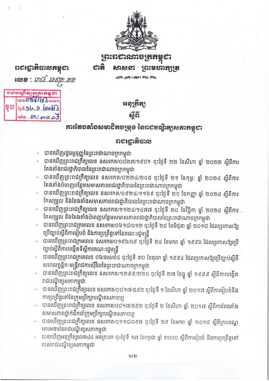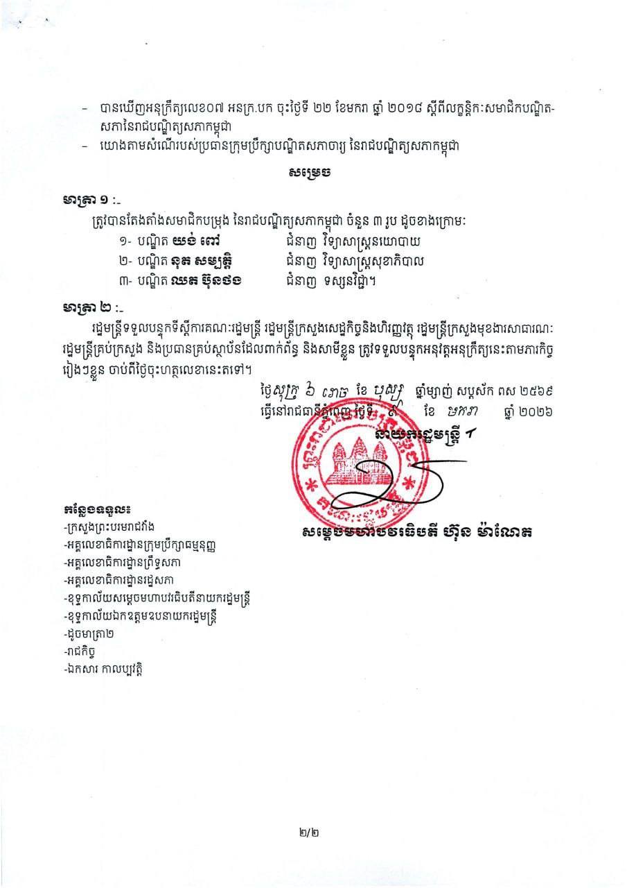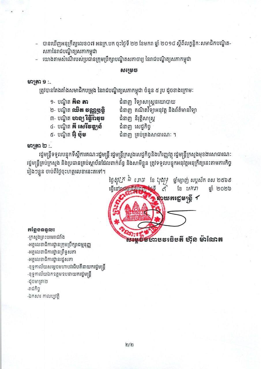 សម្តេចធិបតី ហ៊ុន ម៉ាណែត នាយករដ្ឋមន្ត្រីកម្ពុជា នៅថ្ងៃទី៩ ខែមករា ឆ្នាំ២០២៦ បានចេញអនុក្រឹត្យតែងតាំងបណ្ឌិត ចំនួន ៨រូប ជាសមាជិកបម្រុង នៃរាជបណ្ឌិត្យសភាកម្ពុជា។