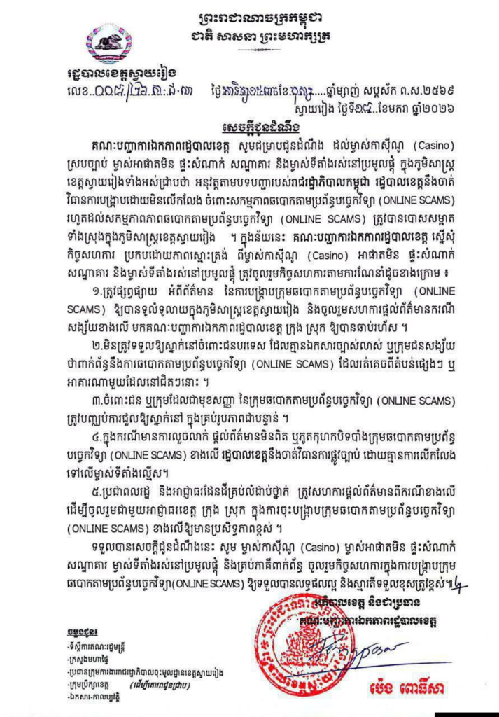 យោងតាមសេចក្តីជូនដំណឹង របស់រដ្ឋបាលខេត្តស្វាយរៀង កាលពីថ្ងៃទី១៨ ខែមករា ឆ្នាំ២០២៦បានឱ្យដឹងថា អនុវត្តតាមបទបញ្ជារបស់រាជរដ្ឋាភិបាលកម្ពុជា រដ្ឋបាលខេត្តនឹងចាត់ វិធានការបង្រ្កាបដោយមិនលើកលែង ចំពោះសកម្មភាពឆបោកតាមប្រព័ន្ធបច្ចេកវិទ្យា (ONLINE SCAMS) រហូតដល់សកម្មភាពភាពឆបោកតាមប្រព័ន្ធបច្ចេកវិទ្យា (ONLINE SCAMS) ត្រូវបានបោសសម្អាត ទាំងស្រុងក្នុងភូមិសាស្ត្រខេត្តស្វាយរៀង។