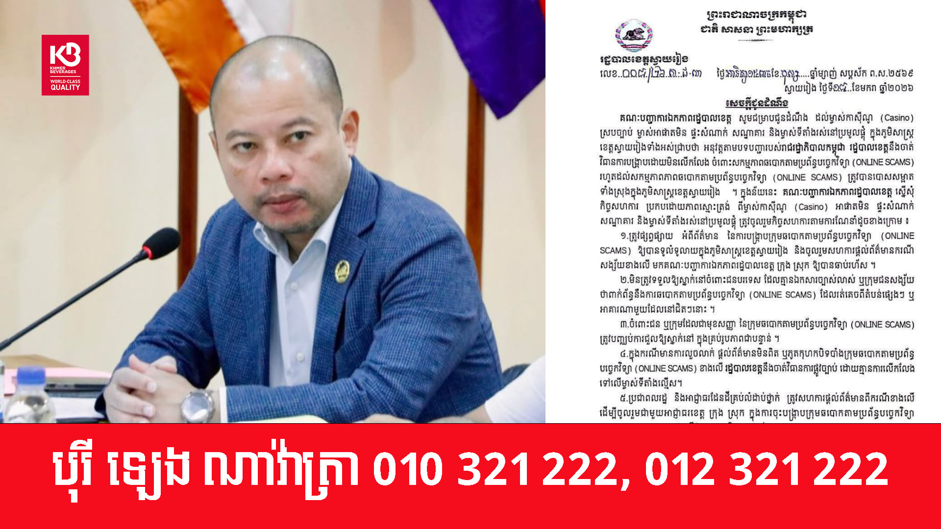 រដ្ឋបាលខេត្តស្វាយរៀង ប្រកាសចាត់វិធានការបង្រ្កាបដោយមិនលើកលែងចំពោះសកម្មភាពឆបោកតាមប្រព័ន្ធបច្ចេកវិទ្យា (ONLINE SCAMS) រហូតដល់សកម្មភាពភាពឆបោកតាមប្រព័ន្ធបច្ចេកវិទ្យា (ONLINE SCAMS) ត្រូវបានបោសសម្អាត ទាំងស្រុងក្នុងភូមិសាស្ត្រខេត្តស្វាយរៀង។