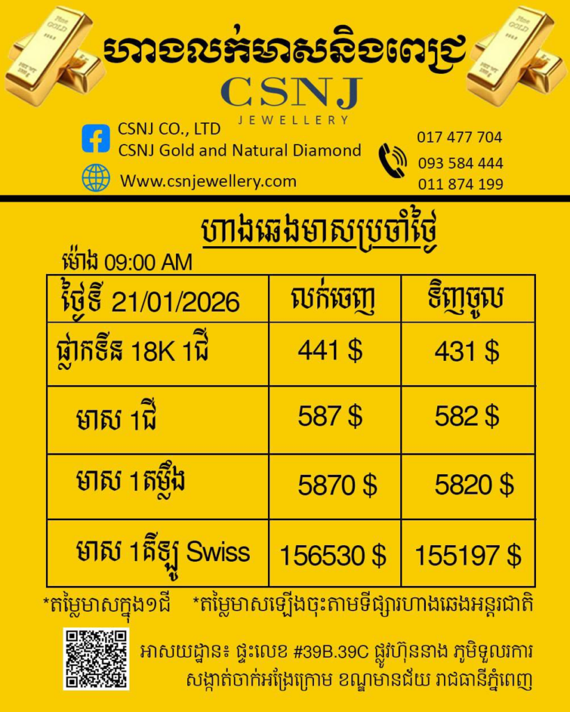 តម្លៃមាសនៅថ្ងៃទី២១ ខែមករា ឆ្នាំ២០២៦នេះ បានហក់ឡើងខ្ពស់ខ្លាំង ដែលអាចរាប់បានថាជាការបំបែកកំណត់ត្រាពិភពលោកសារជាថ្មីម្ដងទៀត ដោយមាសមានតម្លៃ ៥៨៧ដុល្លារ នៅក្នុងមួយជី ជាតម្លៃលក់ចេញ និងទិញចូលក្នុងតម្លៃ ៥៨២ដុល្លារ នៅក្នុងមួយជី។ នេះបើយោងតាមហាងឆេងមាស ពីហាងមាសពេជ្រ CSNJ របស់លោកឧកញ៉ា ចិន សំណាង នាព្រឹក ម៉ោង៩:០០ នាទី ថ្ងៃទី២១ ខែមករានេះ។