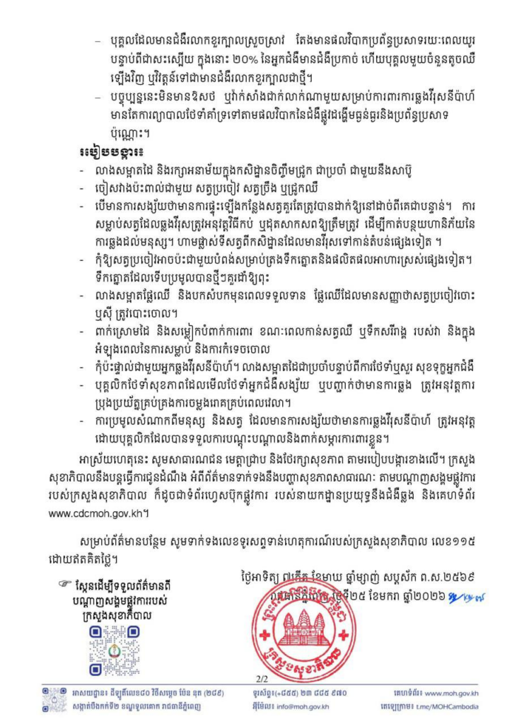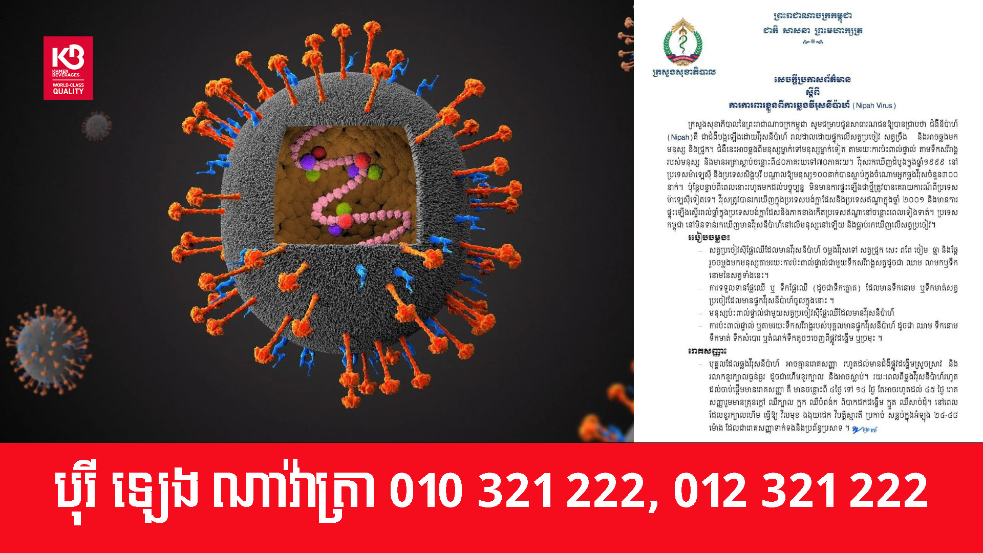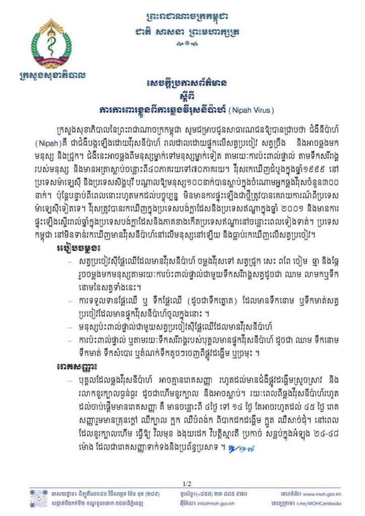 ក្រសួងសុខាភិបាល នាថ្ងៃទី២៥ ខែមករា ឆ្នាំ២០២៥ បានសេចក្តីប្រកាសព័ត៌មាន ស្តីពី ការការពារខ្លួនពីការឆ្លងវីរុសនីប៉ាហ៍ (Nipah Virus) ដោយក្រសួងសុខាភិបាល បានឱ្យដឹងថា ជំងឺនីប៉ាហ៍ (Nipah)គឺ ជាជំងឺបង្កឡើងដោយវីរុសនីប៉ាហ៍ រាលដាលដោយផ្ទុកលើសត្វប្រចៀវ សត្វប្រឹង និងអាចឆ្លងមកមនុស្ស និងជ្រូក។ ជំងឺនេះអាចឆ្លងពីមនុស្សម្នាក់ទៅមនុស្សម្នាក់ទៀត តាមរយៈការប៉ះពាល់ផ្ទាល់ តាមទឹកសរីរាង្គ របស់មនុស្ស និងមានអត្រាស្លាប់ចន្លោះពី៤០ភាគរយទៅ៧០ភាគរយ។ វីរុសរកឃើញដំបូងក្នុងឆ្នាំ១៩៩៩ នៅប្រទេសម៉ាឡេស៊ី និងប្រទេសសិង្ហបុរី បណ្តាលឱ្យមនុស្ស១០០នាក់បានស្លាប់ក្នុងចំណោមអ្នកឆ្លងវីរុសចំនួន៣០០ នាក់។ ប៉ុន្តែបន្ទាប់ពីពេលនោះរហូតមកដល់បច្ចុប្បន្ន មិនមានការផ្ទុះឡើងជាថ្មីត្រូវបានគេរាយការណ៍ពីប្រទេស ម៉ាឡេស៊ីទៀតទេ។