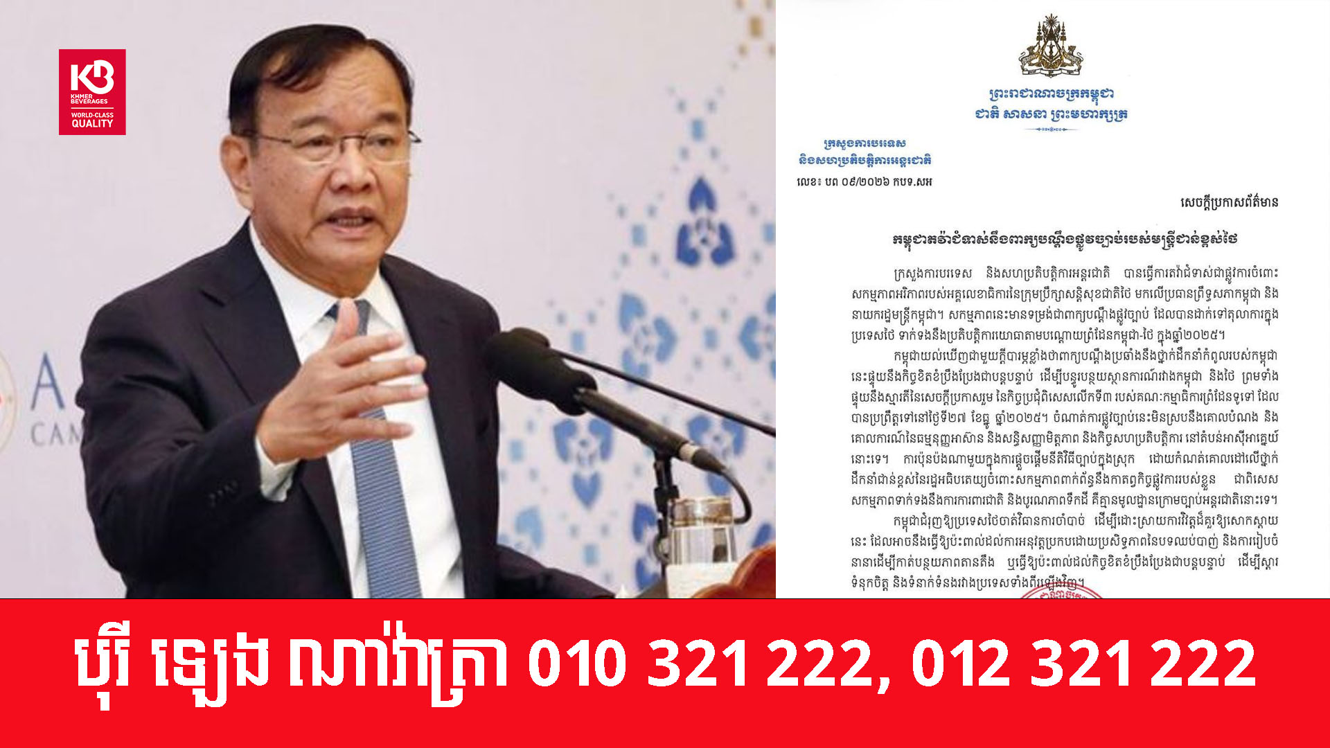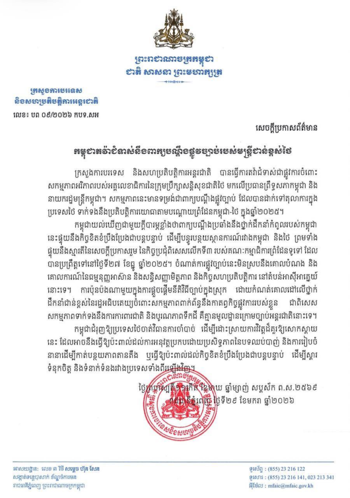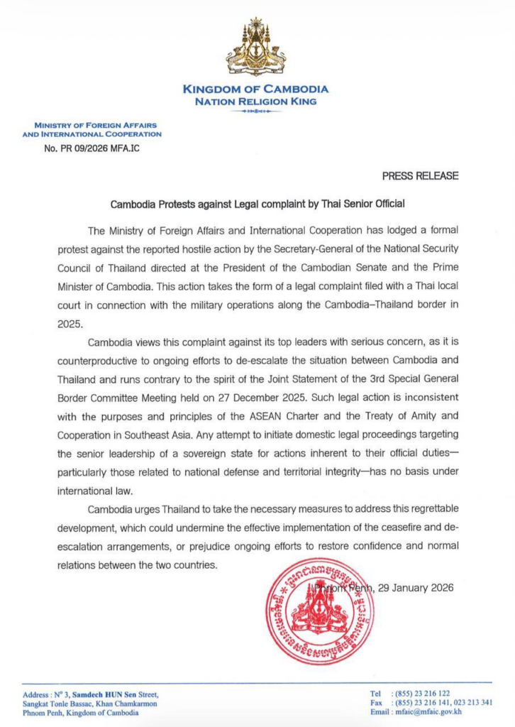 យោងតាមសេចក្ដីប្រកាសព័ត៌មាន ចុះថ្ងៃទី២៩ ខែមករា ឆ្នាំ២០២៦ ក្រសួងការបរទេសបានឱ្យដឹងថា កម្ពុជាយល់ឃើញជាមួយក្តីបារម្ភខ្លាំងថាពាក្យបណ្តឹងប្រឆាំងនឹងថ្នាក់ដឹកនាំកំពូលរបស់កម្ពុជា នេះផ្ទុយនឹងកិច្ចខិតខំប្រឹងប្រែងជាបន្តបន្ទាប់ ដើម្បីបន្ធូរបន្ថយស្ថានការណ៍រវាងកម្ពុជា និងថៃ ព្រមទាំង ផ្ទុយនឹងស្មារតីនៃសេចក្ដីប្រកាសរួម នៃកិច្ចប្រជុំពិសេសលើកទី៣ របស់គណៈកម្មាធិការព្រំដែនទូទៅ ដែលបានប្រព្រឹត្តទៅនៅថ្ងៃទី២៧ ខែធ្នូ ឆ្នាំ២០២៥។ ចំណាត់ការផ្លូវច្បាប់នេះមិនស្របនឹងគោលបំណង និងគោលការណ៍នៃធម្មនុញ្ញអាស៊ាន និងសន្ធិសញ្ញាមិត្តភាព និងកិច្ចសហប្រតិបត្តិការ នៅតំបន់អាស៊ីអាគ្នេយ៍នោះទេ។ ការប៉ុនប៉ងណាមួយក្នុងការផ្តួចផ្តើមនីតិវិធីច្បាប់ក្នុងស្រុក ដោយកំណត់គោលដៅលើថ្នាក់ដឹកនាំជាន់ខ្ពស់នៃរដ្ឋអធិបតេយ្យចំពោះសកម្មភាពពាក់ព័ន្ធនឹងកាតព្វកិច្ចផ្លូវការរបស់ខ្លួន ជាពិសេសសកម្មភាពទាក់ទងនឹងការការពារជាតិ និងបូរណភាពទឹកដី គឺគ្មានមូលដ្ឋានក្រោមច្បាប់អន្តរជាតិនោះទេ។
