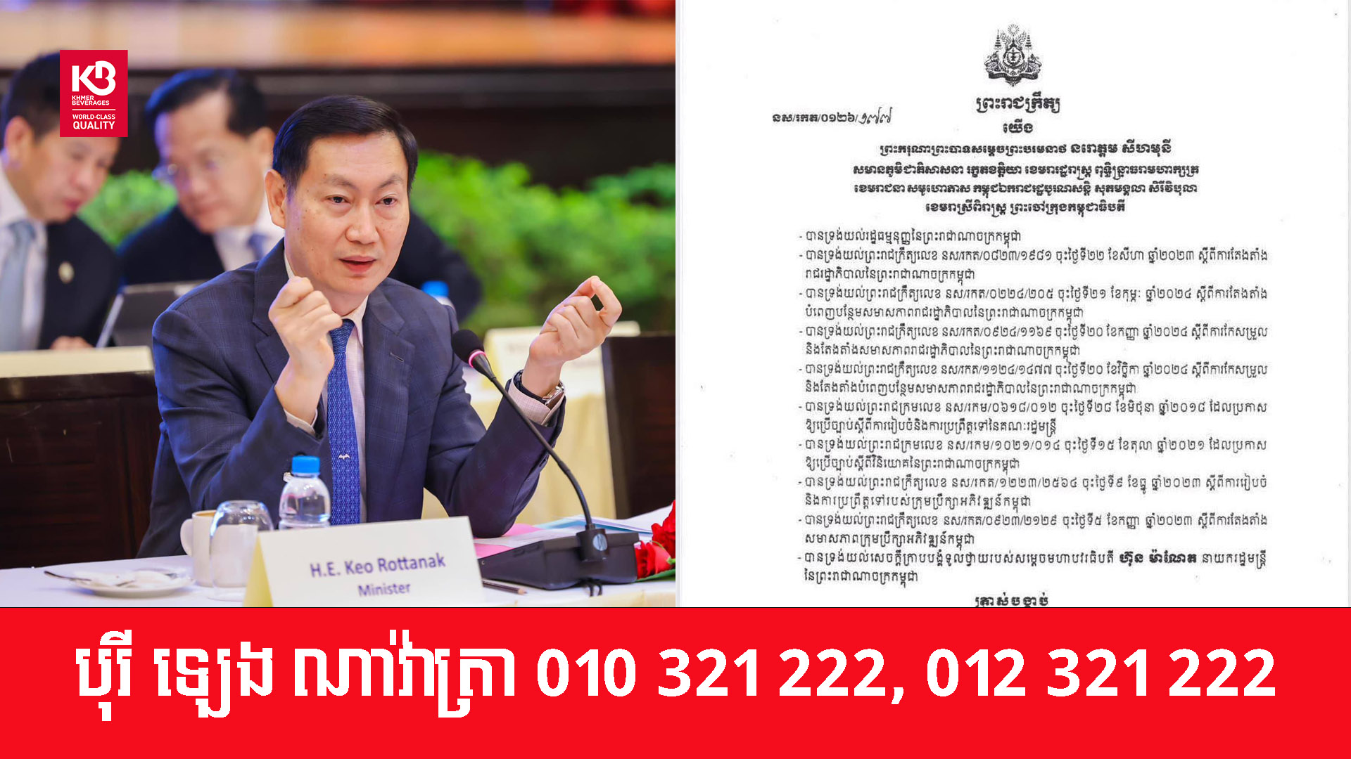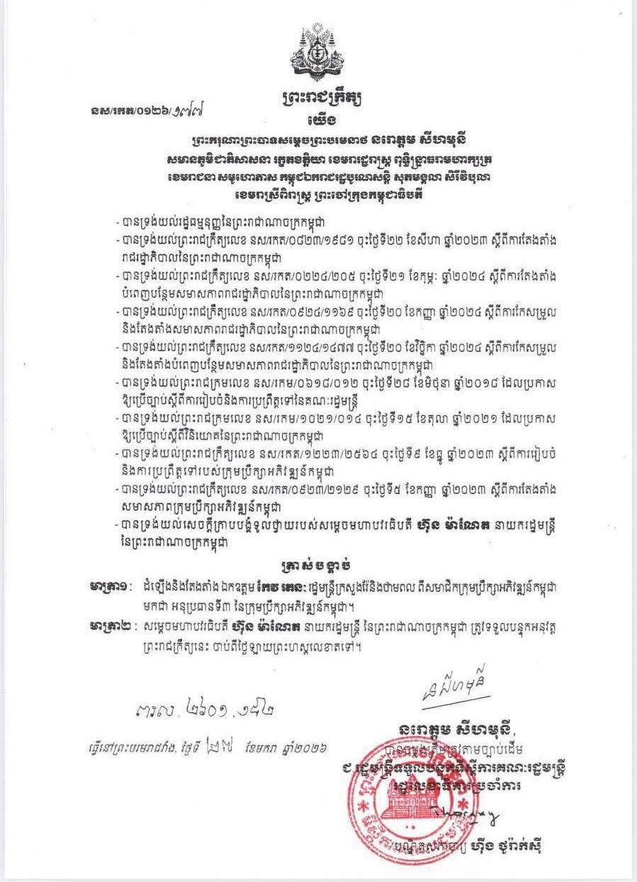 ព្រះករុណាព្រះបាទសម្តេចព្រះបរមនាថ នរោត្តម សីហមុនី ព្រះមហាក្សត្រនៃព្រះរាជាណាចក្រកម្ពុជា បានចេញព្រះរាជក្រឹត្យត្រាស់បង្គាប់ដំឡើង និងតែងតាំង ឯកឧត្តម កែវ រតនៈ រដ្ឋមន្ត្រីក្រសួងរ៉ែនិងថាមពល ពីសមាជិកក្រុមប្រឹក្សាអភិវឌ្ឍន៍កម្ពុជា (CDC) ទៅជា អនុប្រធានទី៣ នៃក្រុមប្រឹក្សាអភិវឌ្ឍន៍កម្ពុជា នៅថ្ងៃទី២៧ ខែមករា ឆ្នាំ២០២៦។