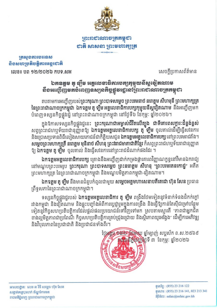 ក្រសួងការបរទេស បានបន្តថា ការអញ្ជើញបំពេញទស្សនកិច្ចផ្លូវរដ្ឋមកកាន់កម្ពុជារបស់ លោក តូ ឡឺម អគ្គលេខាធិការបក្សកុម្មុយនីស្តវៀតណាម គឺតបតាមការអញ្ជើញរបស់ព្រះករុណា ករុណា ព្រះបាទសម្តេច ព្រះបរមនាថ នរោត្តម 3 ព្រះបរមនាថ នរោត្តម សីហមុនី ព្រះមហាក្សត្រ នៃព្រះរាជាណាចក្រកម្ពុជា។