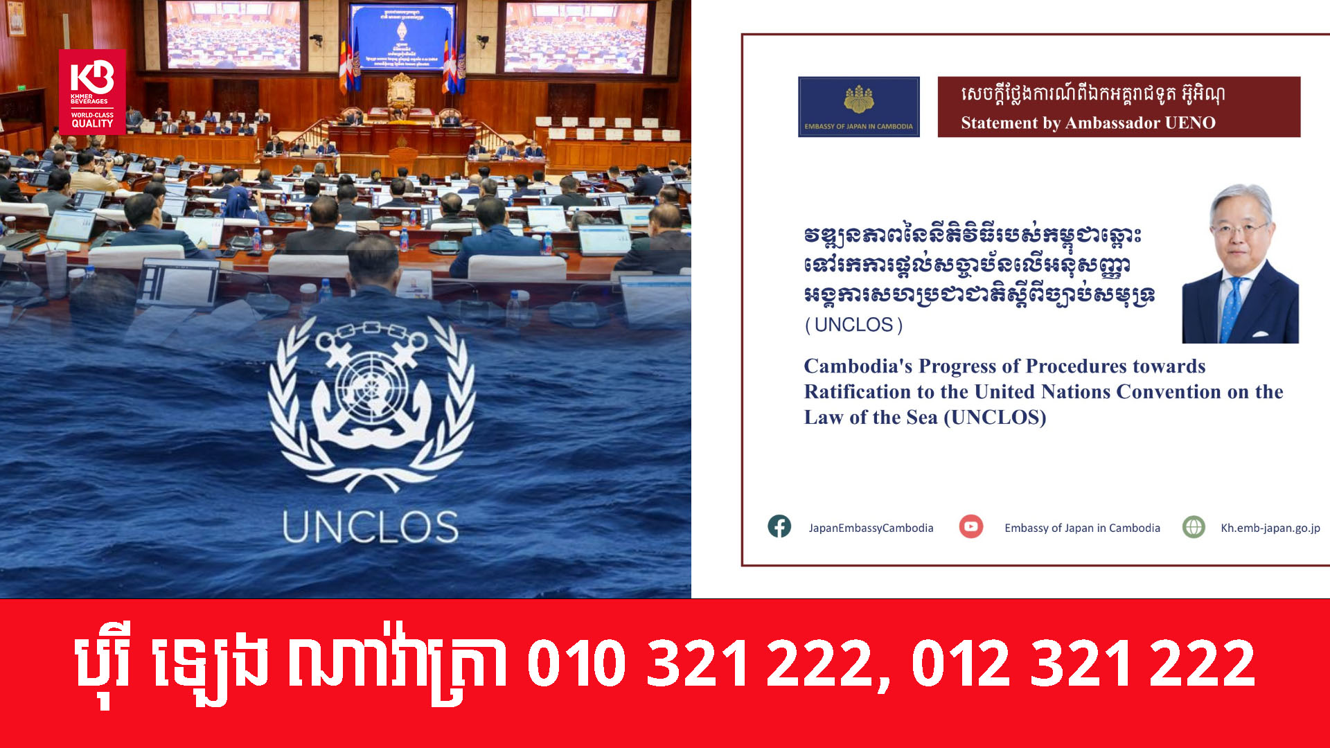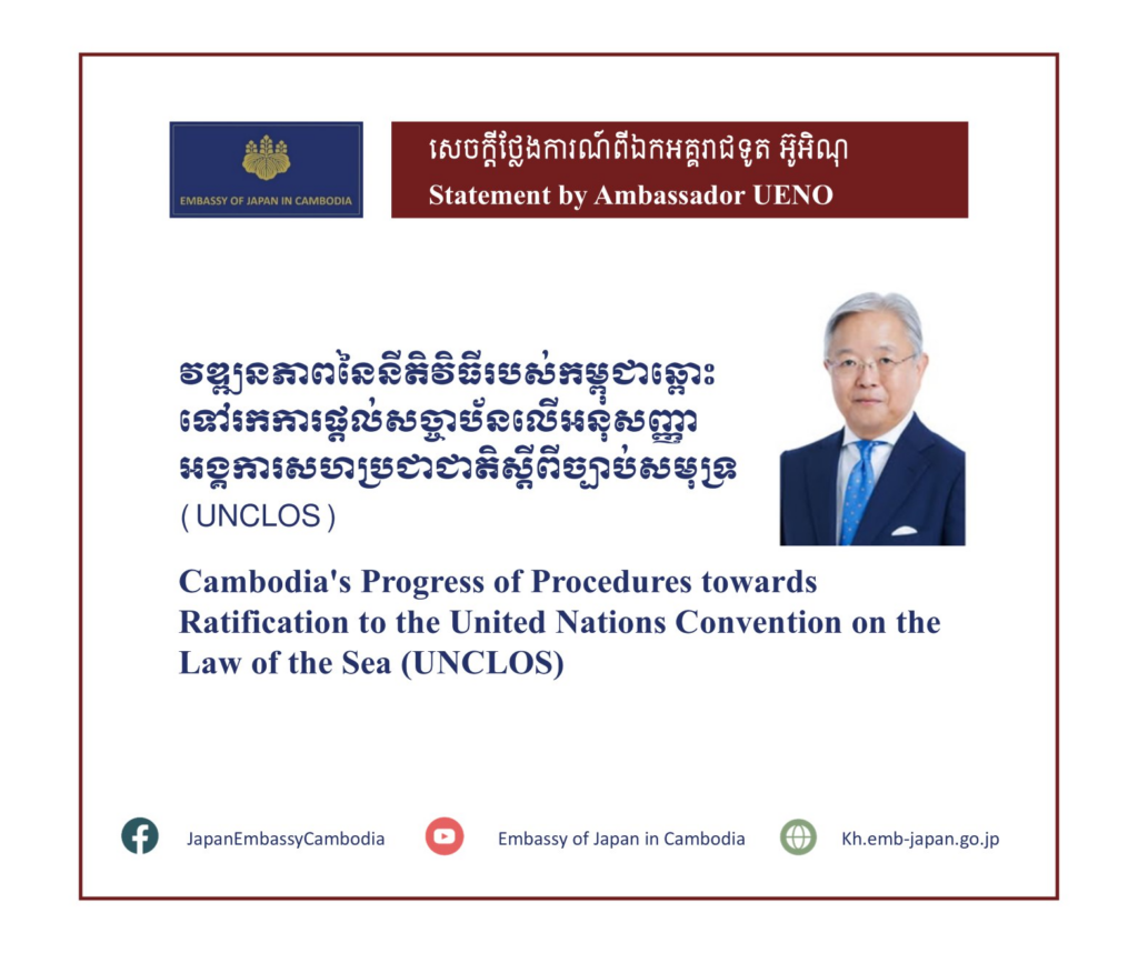 ឯកអគ្គរាជទូតជប៉ុនប្រចាំកម្ពុជា លោក អ៊ូអិណុ អាត់ស៊ូស៊ី បានប្រកាសស្វាគមន៍យ៉ាងកក់ក្តៅចំពោះវឌ្ឍនភាពនៃនីតិវិធី ដើម្បីឆ្ពោះទៅរកការផ្តល់សច្ចាប័នលើអនុសញ្ញាអង្គការសហប្រជាជាតិស្តីពីច្បាប់សមុទ្រ (UNCLOS) នៅកម្ពុជា រួមទាំងការអនុម័តនៅក្នុងសម័យប្រជុំពេញអង្គរបស់ព្រឹទ្ធសភា (ថ្ងៃទី ២១ ខែមករា) និងរដ្ឋសភា (ថ្ងៃទី ១៦ ខែមករា)។