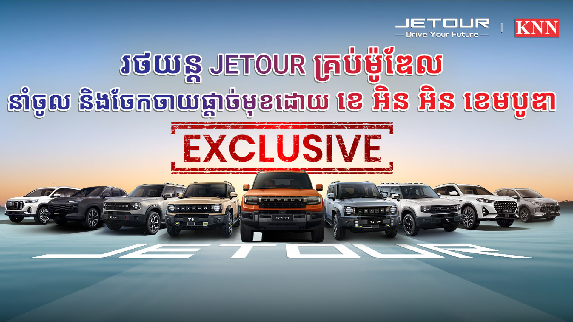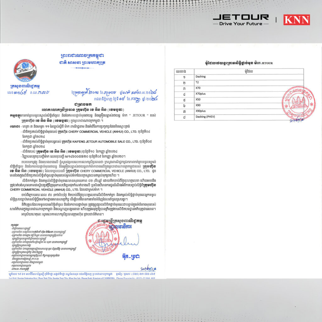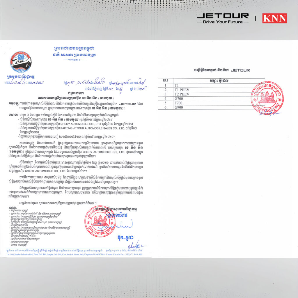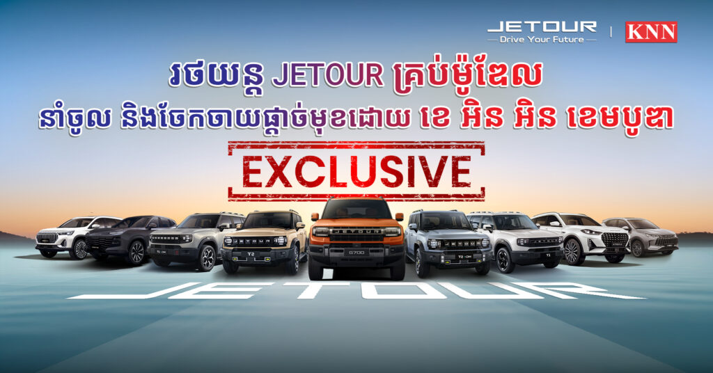 JETOUR ជាម៉ាកយីហោរថយន្តដែលត្រូវបាននាំចូល និងចែកចាយផ្តាច់មុខតែមួយគត់ក្នុងប្រទេសកម្ពុជាដោយក្រុមហ៊ុន ខេ អិន អិន ខេមបូឌា (KNN Cambodia) ដែលកំពុងមានឈ្មោះបោះសម្លេង និងទទួលស្គាល់យ៉ាងខ្លាំងពីសំណាក់អ្នកគាំទ្រក្នុងទីផ្សារកម្ពុជា។ គួរបញ្ជាក់ផងដែរថា រាប់ចាប់តាំងពីខែកញ្ញា ឆ្នាំ 2024 មក JETOUR Cambodia បានបម្រើដល់តម្រូវការអតិថិជន ដែលស្វែងរករថយន្តទំនើប ទាន់សម័យ ភ្ជាប់មកជាមួយនូវបច្ចេកវិទ្យាឈានមុខគេ ជាពិសេសគឺ គុណភាពលើសពីតម្លៃ។