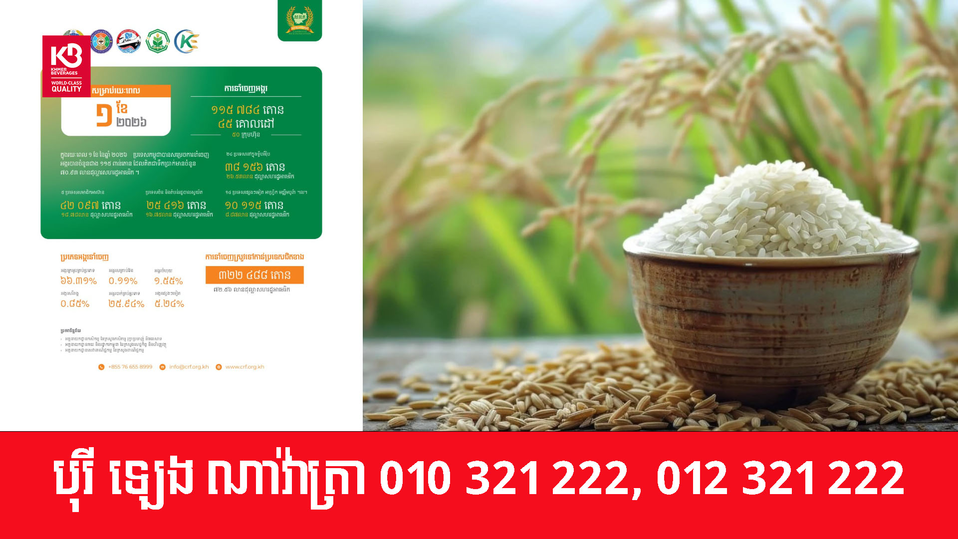 ក្នុងរយៈពេល១ខែនៃឆ្នាំ២០២៦ កម្ពុជាបាននាំចេញអង្ករបានចំនួន ១១៥ ៧៨៤ តោន ទៅកាន់គោលដៅចំនួន ៤៥ ប្រទេស ដោយគិតជាទឹកប្រាក់បានចំនួន ៧០.៩៣ លានដុល្លារសហរដ្ឋអាមេរិក។នេះបើយោងតាមរបាយការណ៍ពីសហព័ន្ធស្រូវអង្ករកម្ពុជា ដែលផ្សាយចេញនៅថ្ងៃទី១១ ខែគុម្ភៈ ឆ្នាំ២០២៦។