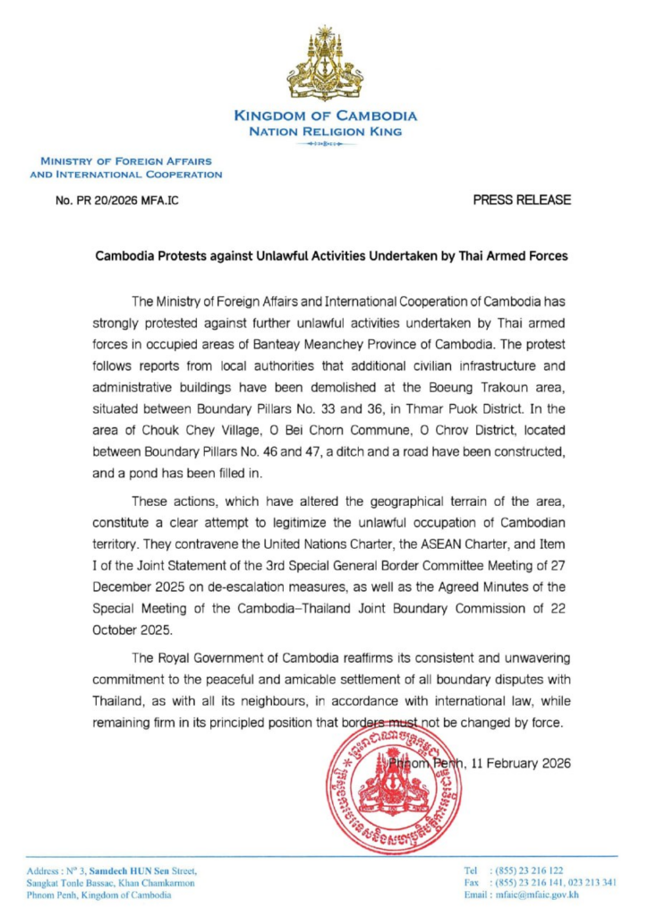 យោងតាមសេចក្ដីប្រកាសព័ត៌មាន ចុះថ្ងៃទី១១ ខែកុម្ភៈ ឆ្នាំ២០២៦ ក្រសួងការបរទេសបានឱ្យដឹងថា ការតវ៉ានេះធ្វើឡើងបន្ទាប់ ពីមានរបាយការណ៍ពីអាជ្ញាធរមូលដ្ឋានថា ហេដ្ឋារចនាសម្ព័ន្ធស៊ីវិល និងអគាររដ្ឋបាលបន្ថែមទៀត ត្រូវបាន យោធាថៃវាយកម្ទេចបំផ្លិចបំផ្លាញនៅតំបន់បឹងត្រកួន ស្ថិតនៅចន្លោះបង្គោលព្រំដែនលេខ ៣៣ និង ៣៦ ក្នុងស្រុកថ្មពួក។ នៅតំបន់ភូមិជោគជ័យ ឃុំអូរបីជាន់ ស្រុកអូរជ្រៅ ដែលស្ថិតនៅ ចន្លោះ បង្គោលព្រំដែនលេខ៤៦ និង៤៧. មានការជីកប្រឡាយ និងសាងសង់ផ្លូវមួយខ្សែ ព្រមទាំងការចាក់ដីលុបស្រះទឹក។