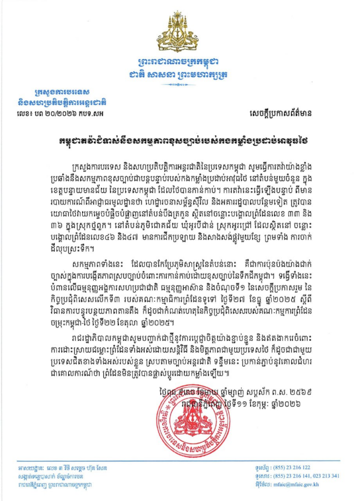 ក្រសួងការបរទេសថា សកម្មភាពទាំងនេះ ដែលបានកែប្រែភូមិសាស្ត្រនៃតំបន់នោះ គឺជាការប៉ុនប៉ងយ៉ាងជាក់ ច្បាស់ក្នុងការបង្កើតភាពស្របច្បាប់ចំពោះការកាន់កាប់ដោយខុសច្បាប់នៃទឹកដីកម្ពុជា។ ទង្វើទាំងនេះ បំពានលើធម្មនុញ្ញអង្គការសហប្រជាជាតិ ធម្មនុញ្ញអាស៊ាន និងចំណុចទី១ នៃសេចក្តីប្រកាសរួម នៃ កិច្ចប្រជុំពិសេសលើកទី៣ របស់គណៈកម្មាធិការព្រំដែនទូទៅ ថ្ងៃទី២៧ ខែធ្នូ ឆ្នាំ២០២៥ ស្តីពី វិធានការបន្ធូរបន្ថយភាពតានតឹង ក៏ដូចជាកំណត់ហេតុនៃកិច្ចប្រជុំពិសេសរបស់គណៈកម្មការព្រំដែន ចម្រុះកម្ពុជា-ថៃ ថ្ងៃទី២២ ខែតុលា ឆ្នាំ២០២៥។