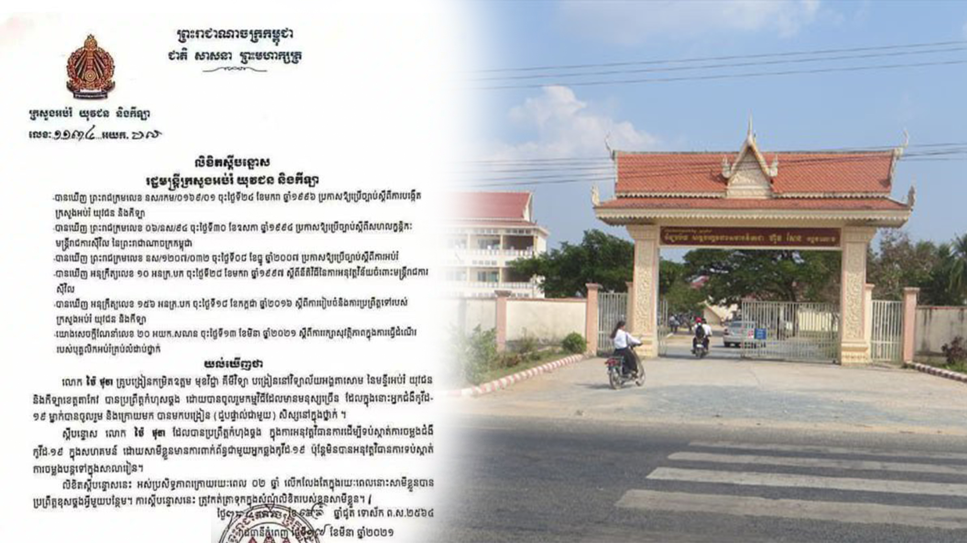 ក្រសួងអប់រំ យុវជន និងកីឡា កាលពីថ្ងៃទី១៧ ខែមីនា ២០២១ បានចេញលិខិតស្ដីបន្ទោសចំៗ ទៅលើលោកគ្រូបង្រៀន មុខវិជ្ជា គីមីវិទ្យា ឈ្មោះ ម៉ៃ ថុនា ដែលបង្រៀននៅវិទ្យាល័យអង្គតាសោម ក្រោយរកឃើញថា គាត់បានចូលរួមកម្មវិធីដែលមានមនុស្សច្រើនកុះករ ហើយកម្មវិធីដដែលនោះ មានអ្នកជំងឺកូវីដ១៩ ចូលរួមដែរ។ បញ្ហានៅត្រង់ថា ក្រោយជាប់ឈ្មោះថា បានចូលរួមកម្មវិធីជួបជុំ ដែលមានអ្នកជំងឺកូវីដទៅដែរនោះ គាត់បានមកបង្រៀន (ជួបផ្ទាល់) សិស្សក្នុងថ្នាក់ធម្មតា ក្រោយកើតហេតុ។
