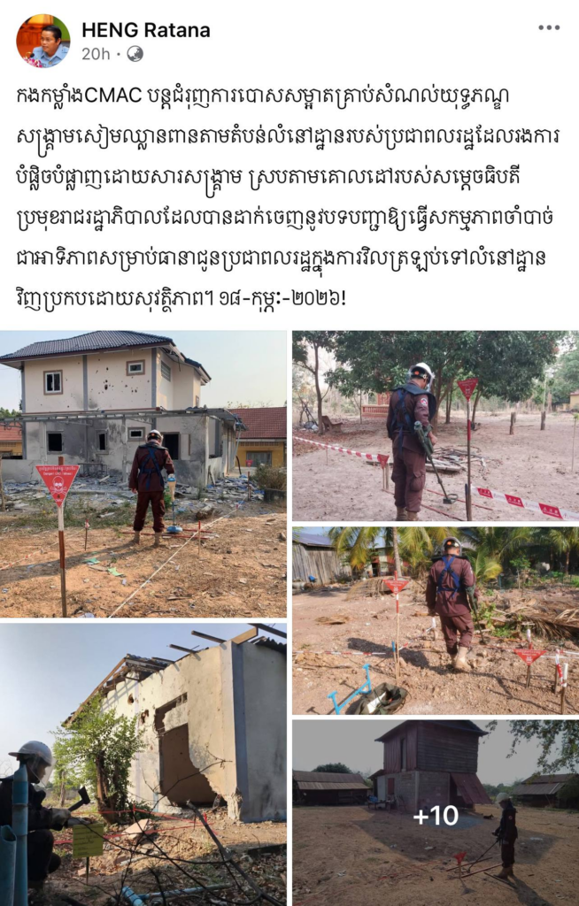 លោក ហេង រតនា ប្រតិភូរាជរដ្ឋាភិបាលទទួលបន្ទុកជា អគ្គនាយកមជ្ឈមណ្ឌលសកម្មភាពកម្ចាត់មីនកម្ពុជា (CMAC) បានបញ្ជាក់ថា កងកម្លាំង CMAC បាន និងកំពុងបន្តជំរុញការបោសសម្អាតគ្រាប់សំណល់យុទ្ធភណ្ឌសង្គ្រាមសៀមឈ្លានពាន តាមតំបន់លំនៅដ្ឋានរបស់ប្រជាពលរដ្ឋ ដែលរងការបំផ្លិចបំផ្លាញដោយសារសង្គ្រាម ស្របតាមគោលដៅរបស់សម្តេចបវរធិបតី ប្រមុខរាជរដ្ឋាភិបាល ដែលបានដាក់ចេញនូវបទបញ្ជាឱ្យធ្វើសកម្មភាពចាំបាច់ជាអាទិភាព សម្រាប់ធានាជូនប្រជាពលរដ្ឋក្នុងការវិលត្រឡប់ ទៅលំនៅដ្ឋានវិញប្រកបដោយសុវត្ថិភាព។ នេះបើយោងតាម បណ្ដាញសង្គមផ្លូវការរបស់លោក នៅថ្ងៃទី១៨ ខែកុម្ភៈ ឆ្នាំ២០២៦។