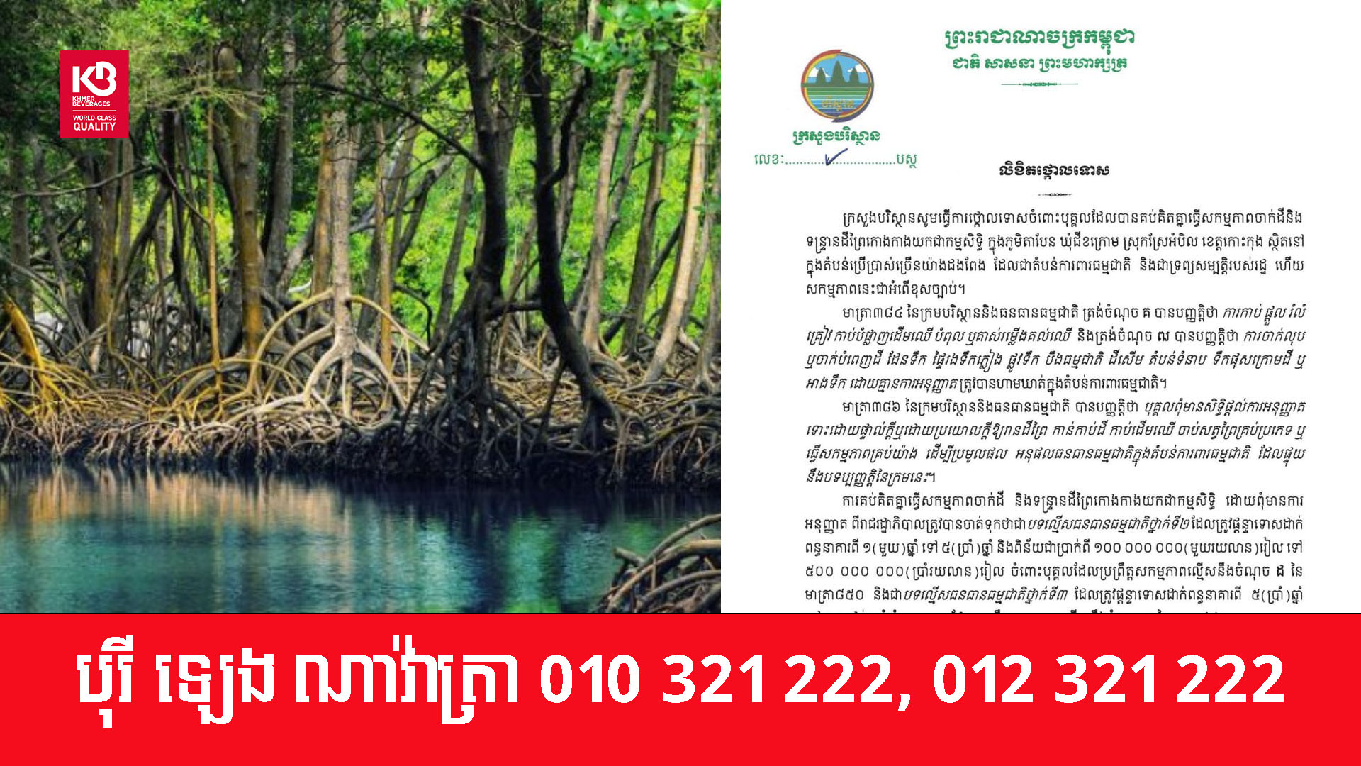 ក្រសួងបរិស្ថាន បានប្រកាសថ្កោលទោសចំពោះបុគ្គលដែលបានគប់គិតគ្នាធ្វើសកម្មភាពចាក់ដីនិង ទន្ទ្រានដីព្រៃកោងកាងយកជាកម្មសិទ្ធិ ក្នុងភូមិតាបែន ឃុំជីខក្រោម ស្រុកស្រែអំបិល ខេត្តកោះកុង ស្ថិតនៅ ក្នុងតំបន់ប្រើប្រាស់ច្រើនយ៉ាងដងពែង ដែលជាតំបន់ការពារធម្មជាតិ និងជាទ្រព្យសម្បត្តិរបស់រដ្ឋ ហើយ សកម្មភាពនេះជាអំពើខុសច្បាប់។