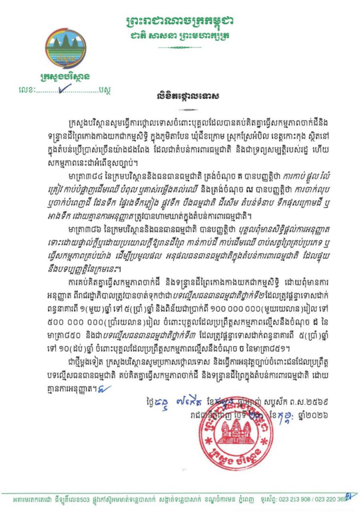 យោងតាមលិខិតថ្កោលទោសរបស់ក្រសួងបរិស្ថាន ចុះថ្ងៃទី២៣ ខែកុម្ភៈ ឆ្នាំ២០២៦ បានបញ្ជាក់ថា យោងតាមមាត្រា៣៨៤ នៃក្រមបរិស្ថាននិងធនធានធម្មជាតិ ត្រង់ចំណុច គ បានបញ្ញត្តិថា ការកាប់ ផ្តួលរំលំ គ្រៀវ កាប់បំផ្លាញដើមឈើ បំពុល ឬគាស់រម្លើងគល់ឈើ និងត្រង់ចំណុច ឍ បានបញ្ញត្តិថា ការចាក់លុប ឬចាក់បំពេញដី ដែនទឹក ផ្ទៃរងទឹកភ្លៀង ផ្លូវទឹក បឹងធម្មជាតិ ដីសើម តំបន់ទំនាប ទឹកផុសក្រោមដី ឬ អាងទឹក ដោយគ្មានការអនុញ្ញាត ត្រូវបានហាមឃាត់ក្នុងតំបន់ការពារធម្មជាតិ។ មាត្រា៣៨៦ នៃក្រមបរិស្ថាននិងធនធានធម្មជាតិ បានបញ្ញត្តិថា បុគ្គលពុំមានសិទ្ធិផ្តល់ការអនុញ្ញាត ទោះដោយផ្ទាល់ក្តីឬដោយប្រយោលក្តីឱ្យរានដីព្រៃ កាន់កាប់ដី កាប់ដើមឈើ ចាប់សត្វព្រៃគ្រប់ប្រភេទ ឬ ធ្វើសកម្មភាពគ្រប់យ៉ាង ដើម្បីប្រមូលផល អនុផលធនធានធម្មជាតិក្នុងតំបន់ការពារធម្មជាតិ ដែលផ្ទុយ នឹងបទប្បញ្ញត្តិនៃក្រមនេះ។