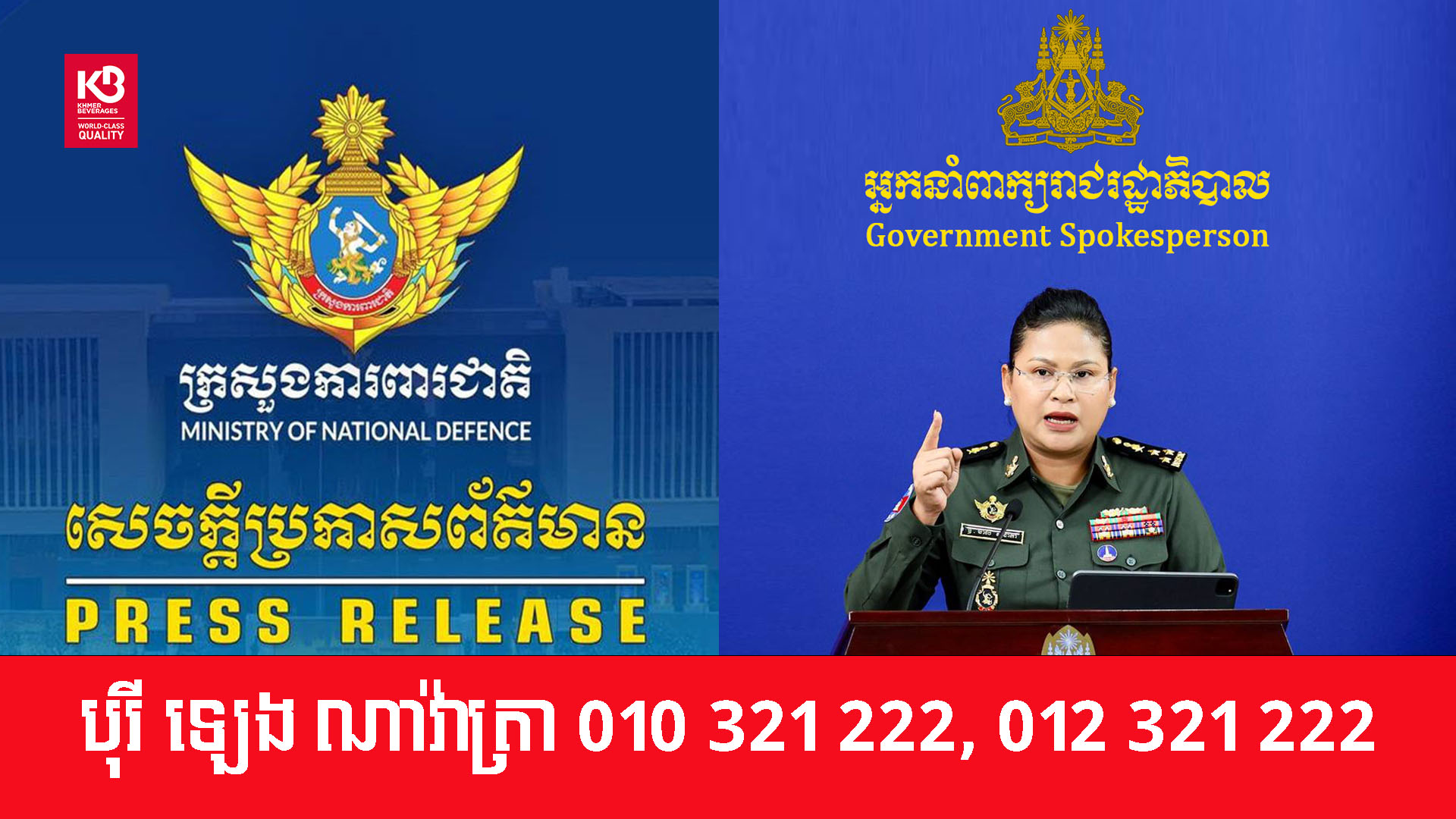 ក្រសួងការពារជាតិកម្ពុជា សូមបញ្ជាក់ពីការប្តេជ្ញាចិត្តយ៉ាងម៉ឺងម៉ាត់ ច្បាស់លាស់ក្នុងការគោរព និងអនុវត្តយ៉ាងពេញលេញខ្ជាប់ខ្ជួន និងប្រកបដោយការទទួលខុសត្រូវខ្ពស់បំផុត ចំពោះសេចក្តីប្រកាសរួមនៃកិច្ចប្រជុំពិសេសលើកទី៣ នៃគណៈកម្មាធិការព្រំដែនទូទៅកម្ពុជា-ថៃ (GBC) ថ្ងៃទី២៧ ខែធ្នូ ឆ្នាំ២០២៥, សេចក្តីថ្លែងការណ៍រួមស្តីពីកិច្ចព្រមព្រៀងសន្តិភាពរវាងកម្ពុជានិងថៃ ថ្ងៃទី២៦ ខែតុលា ឆ្នាំ២០២៥ និងកិច្ចព្រមព្រៀងពាក់ព័ន្ធផ្សេងទៀត ជាពិសេសការប្រឆាំងទៅនឹងព័ត៌មានក្លែងក្លាយ ដើម្បីឆ្ពោះទៅការធ្វើឱ្យប្រសើរឡើងវិញឆាប់រហ័ស និងការវិលត្រឡប់ទៅរកប្រក្រតីភាព សន្តិភាព ស្ថិរភាព និងសុវត្ថិភាពយូរអង្វែងនៅតាមបណ្តោយព្រំដែន។