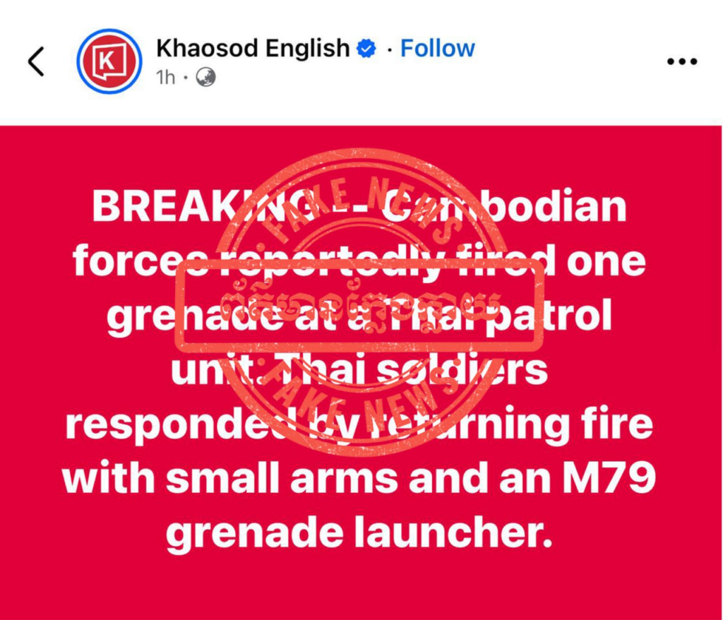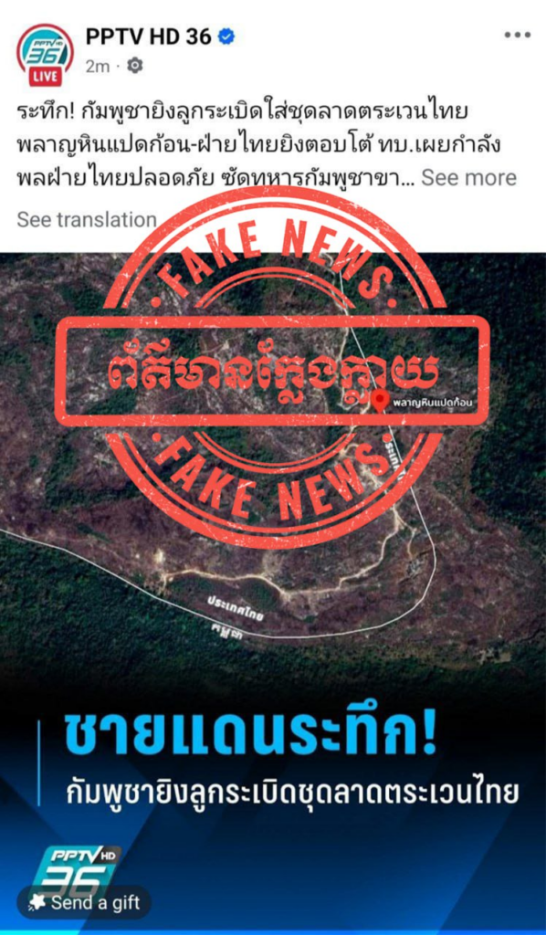 ជាមួយគ្នានេះ ក្រសួងការពារជាតិ សូមអំពាវនាវដល់សាធារណជន និងអ្នកសារព័ត៌មានទាំងអស់ សូមកុំចែករំលែកនូវព័ត៌មានក្លែងក្លាយដែលបានផ្សព្វផ្សាយដោយសារព័ត៌មានថៃខាងលើ ដោយតាមដាន និងទទួលយកតែព័ត៌មានដែលមានប្រភពច្បាស់លាស់ ត្រឹមត្រូវ និងជឿទុកចិត្តបាន ជាពិសេសការផ្តល់ជូនព័ត៌មានដោយរាជរដ្ឋាភិបាល ទំព័រផ្លូវការរបស់ថ្នាក់ដឹកនាំ ក្រសួង និងអង្គភាពពាក់ព័ន្ធរបស់យើង៕