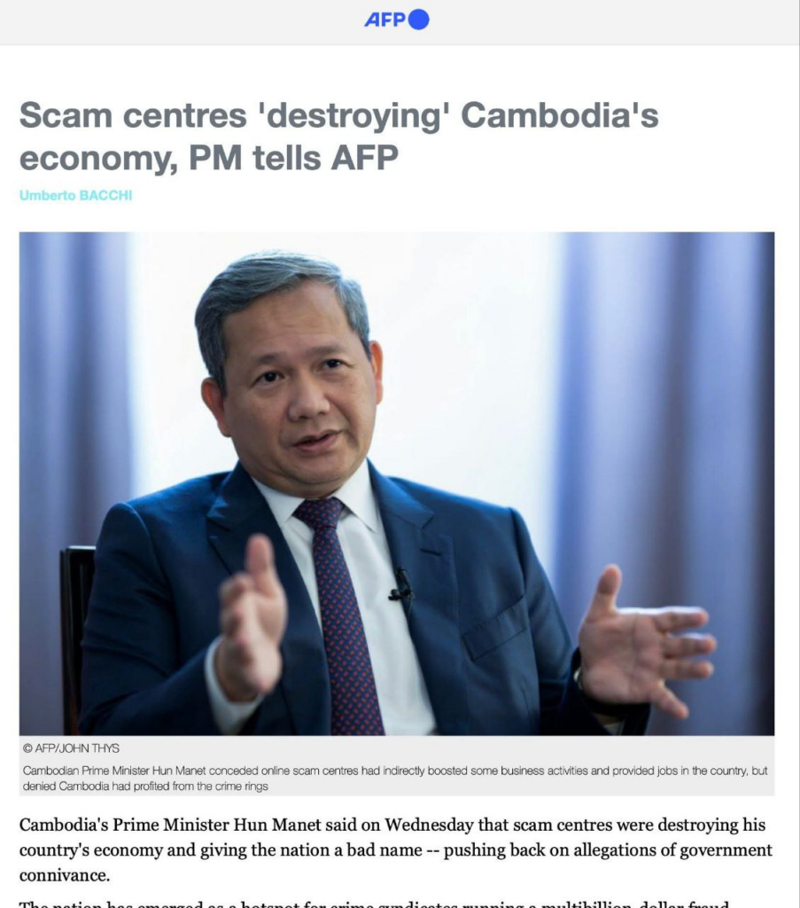 បណ្តាញបោកប្រាស់តាមប្រព័ន្ធបច្ចេកវិទ្យា ឬហៅថាសេដ្ឋកិច្ចខ្មៅ កំពុងបំផ្លាញសេដ្ឋកិច្ចដ៏ស្មោះត្រង់កម្ពុជា និងធ្វើឱ្យខូចកេរ្តិ៍ឈ្មោះរបស់កម្ពុជា។ ហេតុនេះហើយទើបយើងប្តេជ្ញាថា នឹងបោសសំអាតវាឱ្យអស់!”។ នេះបើយោងតាមប្រសាសន៍របស់សម្តេចធិបតី ហ៊ុន ម៉ាណែត នាយករដ្ឋមន្ត្រីកម្ពុជា ក្នុងបទសម្ភាសន៍ជាមួយនឹងបណ្តាញផ្សព្វផ្សាយអន្តរជាតិ AFP នាថ្ងៃទី២៥ ខែកុម្ភៈ ឆ្នាំ២០២៥ នៅប្រទេសបែលហ្សិក។