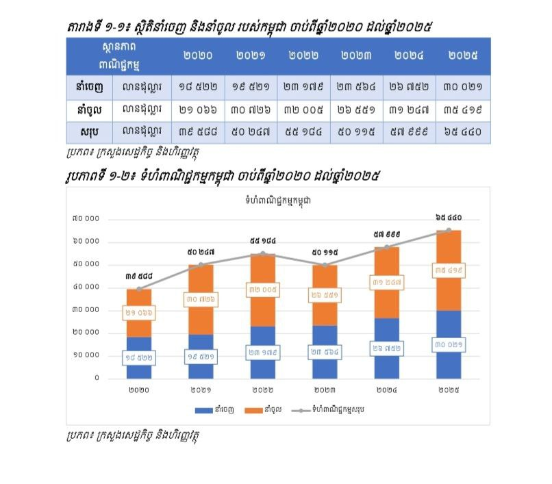 របាយការណ៍ បានបង្ហាញបន្តថា ក្នុងឆ្នាំ២០២៥  ទំហំពាណិជ្ជកម្មអន្តរជាតិរបស់ប្រទេសកម្ពុជា សម្រេចបានប្រមាណ ៣០ ០២១លានដុល្លារអាម៉េរិក (កើនឡើង ១២,២២% បើធៀបឆ្នាំ២០២៤ ប្រមាណ ២៦ ៧៥២លានដុល្លារអាម៉េរិក) ខណៈដែលការនាំចូលសរុបមានចំនួនប្រមាណជា ៣៥ ៤១៩លាន ដុល្លារអាម៉េរិក (កើនឡើង ១៣.៣៥% បើធៀបឆ្នាំ២០២៤ ប្រមាណ ៣១ ២៤៧លានដុល្លារអាម៉េរិក)។