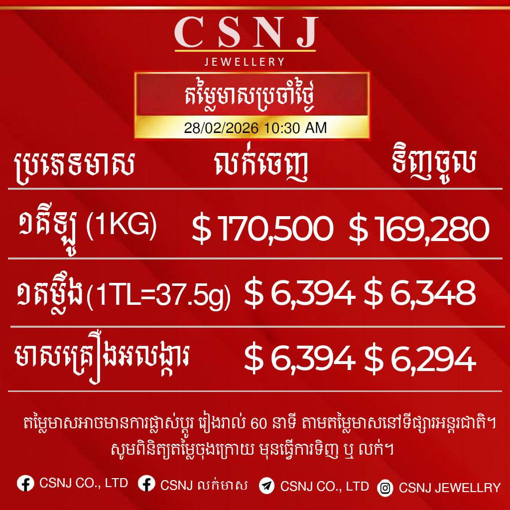តម្លៃមាសនៅថ្ងៃទី២៨ ខែកុម្ភៈ ឆ្នាំ២០២៦នេះ បានឡើងថ្លៃខ្លាំងបើធៀបនឹងថ្ងៃម្សិលមិញ ពោលគឺសម្រាប់មាសគីឡូ មានតម្លៃ ១៧០,៥០០ដុល្លារ នៅក្នុងមួយគីឡូជាតម្លៃលក់ចេញ និងទិញចូលក្នុងតម្លៃ ១៦៩,២៨០ដុល្លារ។