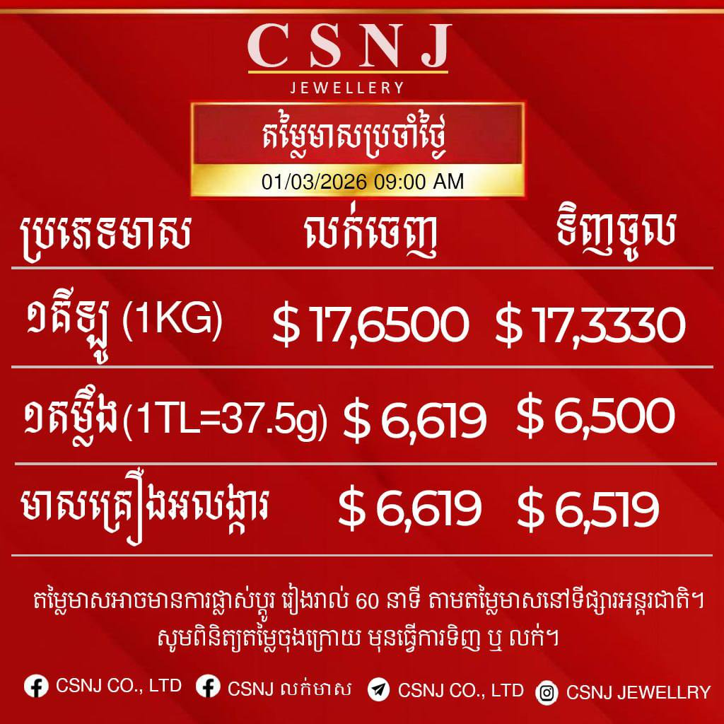តម្លៃមាសនៅថ្ងៃទី១ ខែមីនា ឆ្នាំ២០២៦នេះ បានបន្ដឡើងថ្លៃទៀតហើយ បើធៀបនឹងថ្ងៃម្សិលមិញ ពោលគឺសម្រាប់មាសគីឡូ មានតម្លៃ ១៧៦,៥០០ដុល្លារ នៅក្នុងមួយគីឡូជាតម្លៃលក់ចេញ និងទិញចូលក្នុងតម្លៃ ១៧៣,៣៣០ដុល្លារ។