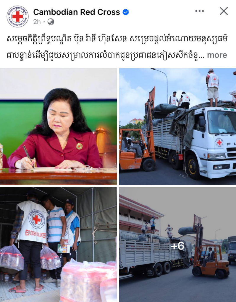 យោងតាមបណ្ដាញសង្គមផ្លូវការរបស់កាកបាទក្រហមកម្ពុជា នៅថ្ងៃទី១ ខែមីនា ឆ្នាំ២០២៦នេះ បានឱ្យដឹងថា ដោយក្តីអាណិតអាសូរ និងមើលឃើញពីទុក្ខលំបាករបស់ប្រជាជនភៀសសឹកដែលនៅមិនទាន់អាចវិលត្រឡប់ទៅលំនៅដ្ឋានវិញ ហើយទទួលរងគ្រោះដោយទឹកភ្លៀងផងនោះ នៅថ្ងៃទី២៨ ខែកុម្ភៈ ឆ្នាំ២០២៦ សម្តេចកិត្តិព្រឹទ្ធបណ្ឌិត ប៊ុន រ៉ានី ហ៊ុនសែន ប្រធានកាកបាទក្រហមកម្ពុជា បានសម្រេចផ្តល់អំណោយមនុស្សធម៌ជាបន្ទាន់ជូនប្រជាជនភៀសសឹកចំនួន ២.៨៨០គ្រួសារ ដែលកំពុងស្នាក់នៅតាមជំរំសុវត្ថិភាព ក្នុងស្រុកអូរជ្រៅ និងស្រុកថ្មពួក ខេត្តបន្ទាយមានជ័យ។