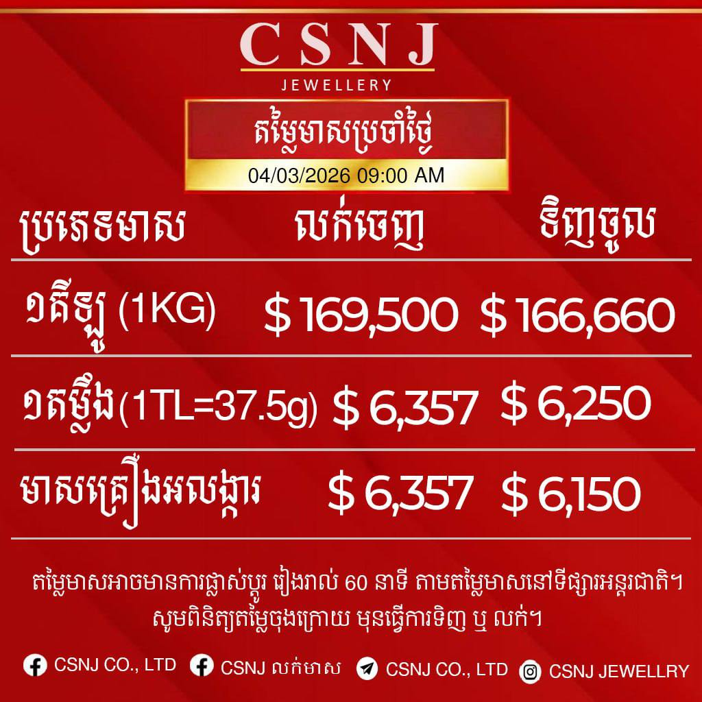 តម្លៃមាសនៅថ្ងៃទី៤ ខែមីនា ឆ្នាំ២០២៦នេះ ធ្លាក់ថ្លៃជាគំហុក បើធៀបនឹងថ្ងៃម្សិលមិញ ពោលគឺសម្រាប់មាសគីឡូ មានតម្លៃ ១៦៩,៥០០ដុល្លារ នៅក្នុងមួយគីឡូជាតម្លៃលក់ចេញ និងទិញចូលក្នុងតម្លៃ ១៦៦,៦៦០ដុល្លារ។